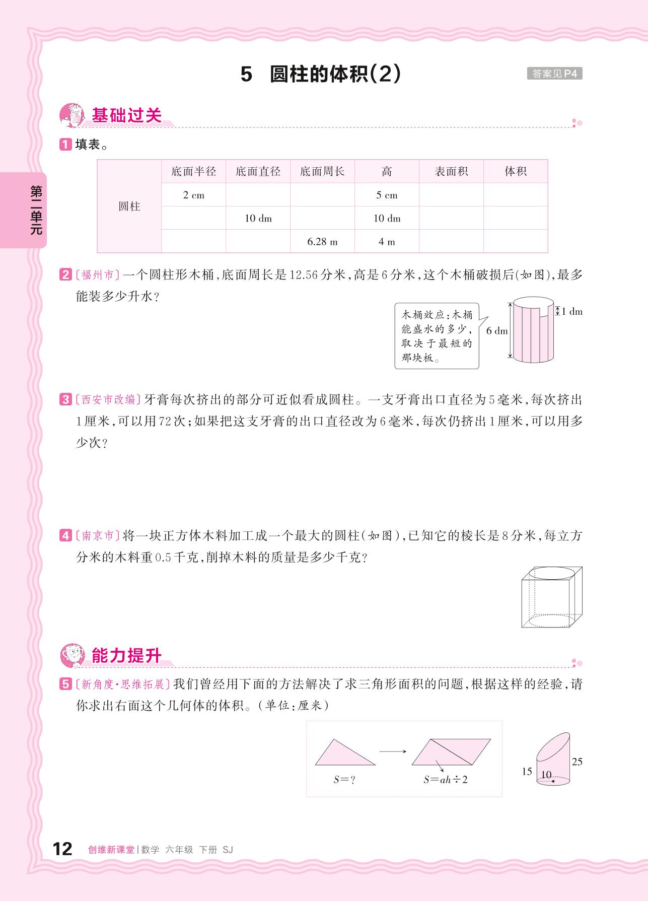 2024春下册六年级数学苏教版 第二单元 圆柱和圆锥——5. 圆柱的体积(2)