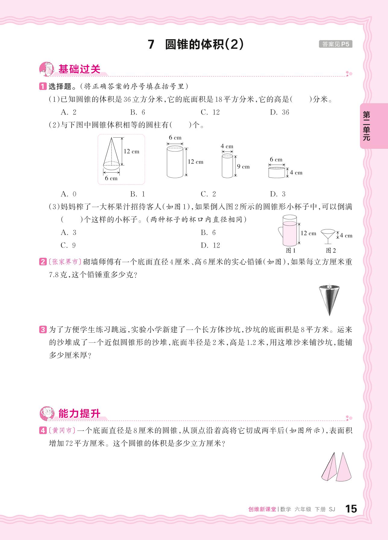 2024春下册六年级数学苏教版 第二单元 圆柱和圆锥——7. 圆锥的体积(2)