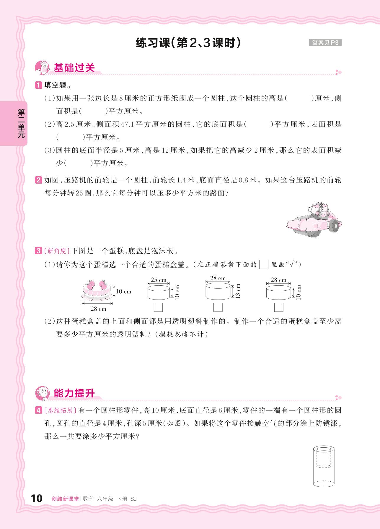 2024春下册六年级数学苏教版 第二单元 圆柱和圆锥——认识圆柱和圆锥、圆柱的侧面积与表面积、圆柱表面积计算的实际应用练习课