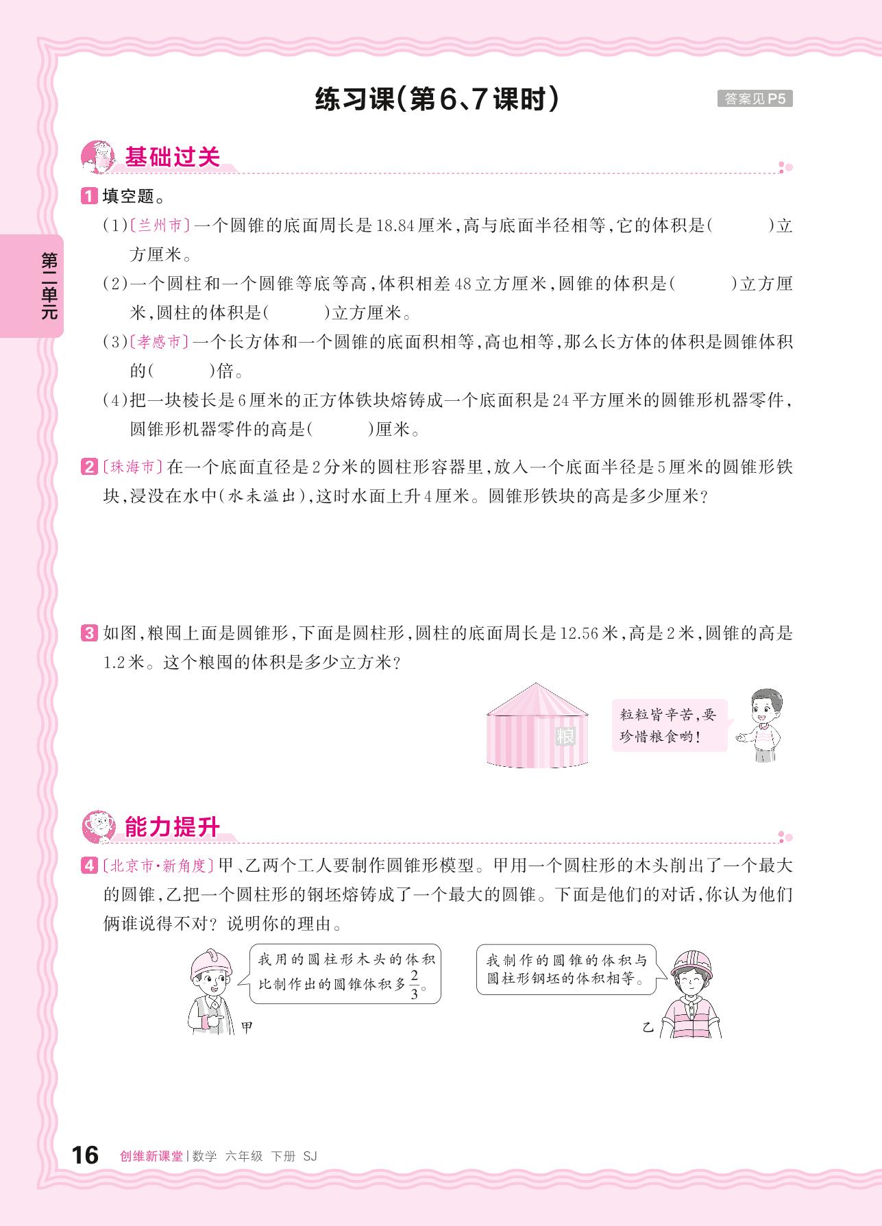 2024春下册六年级数学苏教版 第二单元 圆柱和圆锥——圆锥的体积练习课