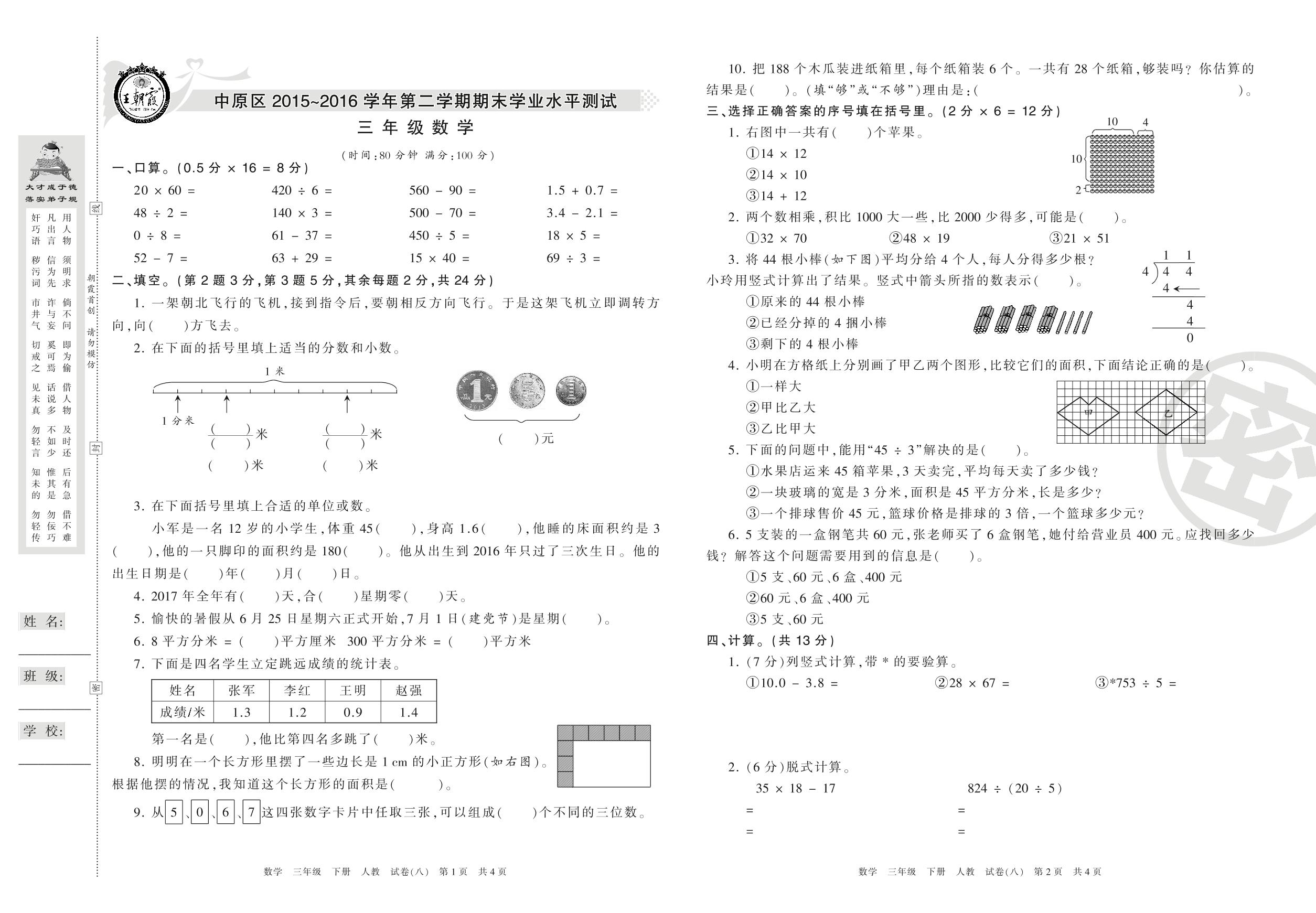 2015-2016学年第二学期郑州市中原区三年级数学试卷(人教版)【8】