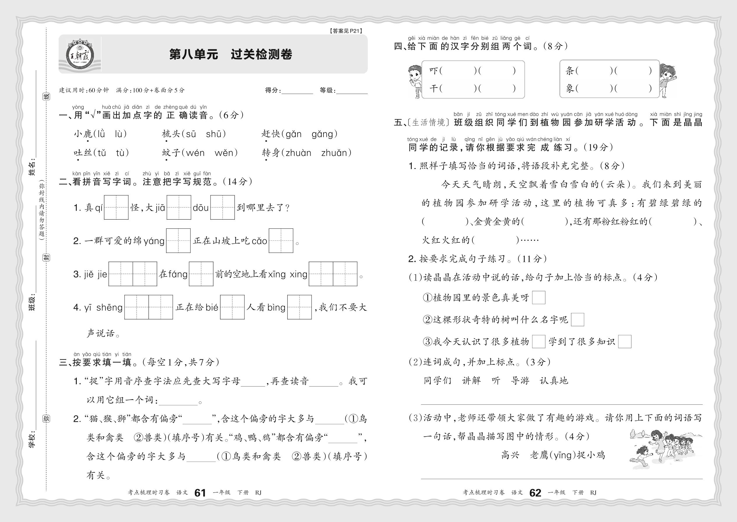 2024春下册一年级语文人教版 第八单元 过关检测卷