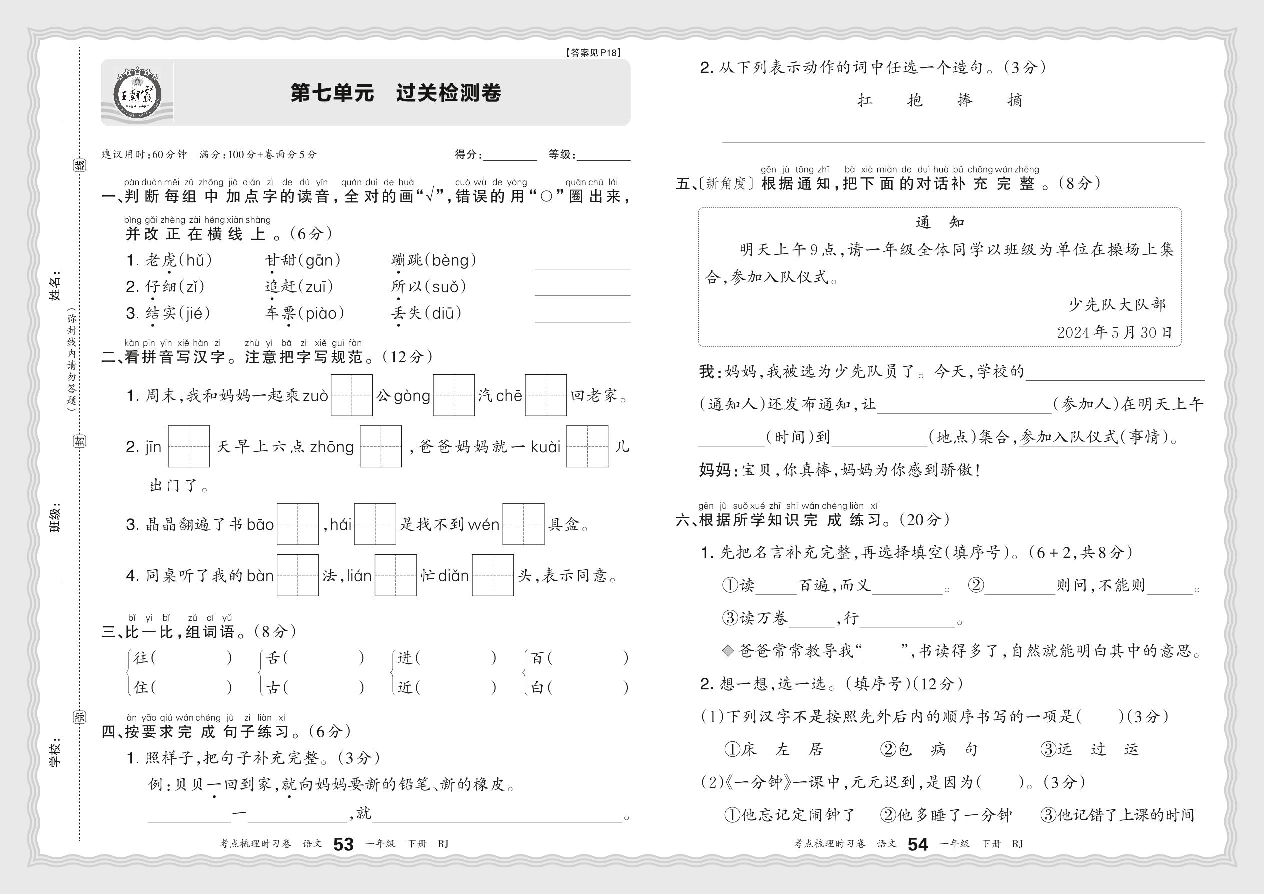 2024春下册一年级语文人教版 第七单元 过关检测卷