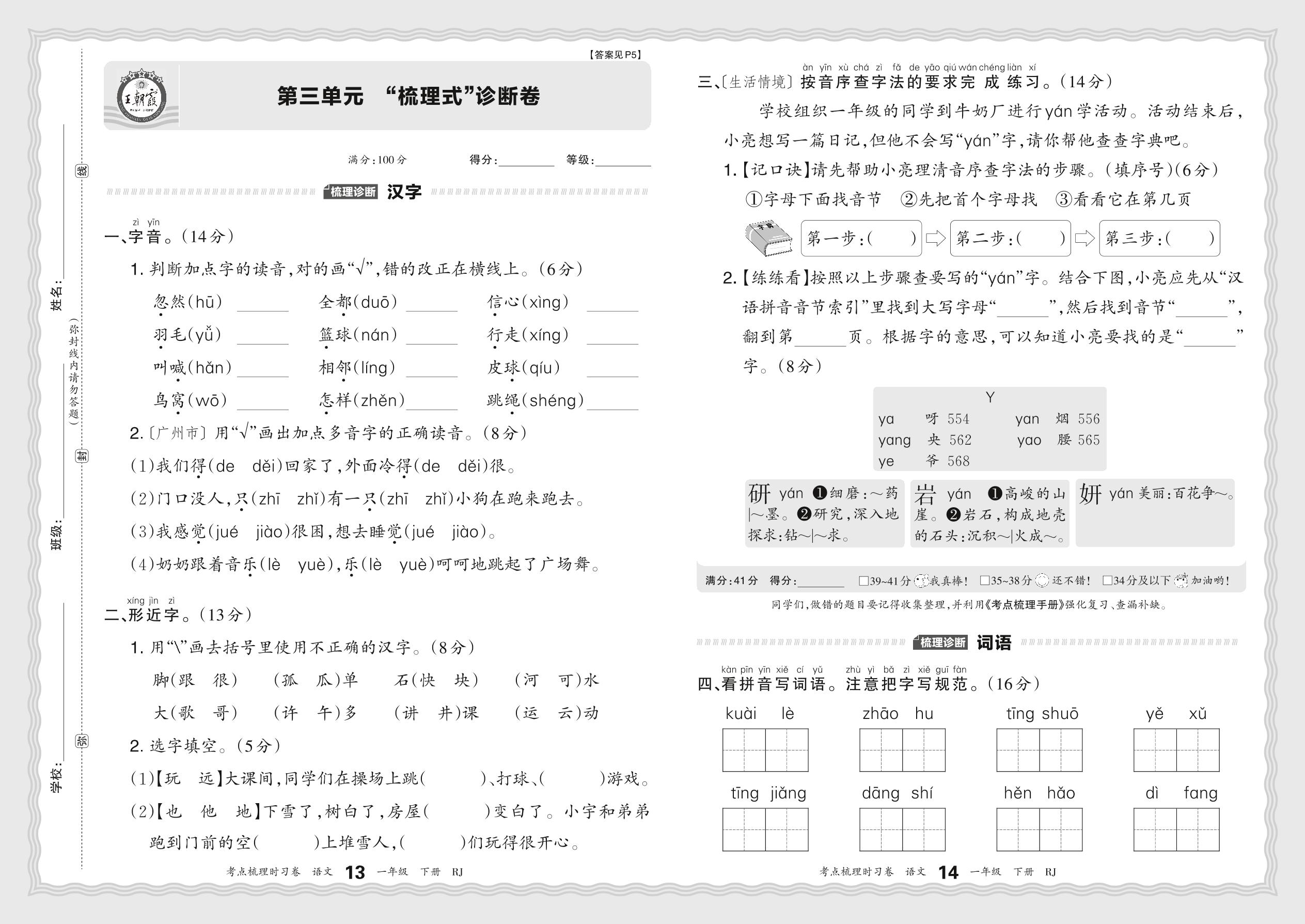 2024春下册一年级语文人教版 第三单元 “梳理式”诊断卷