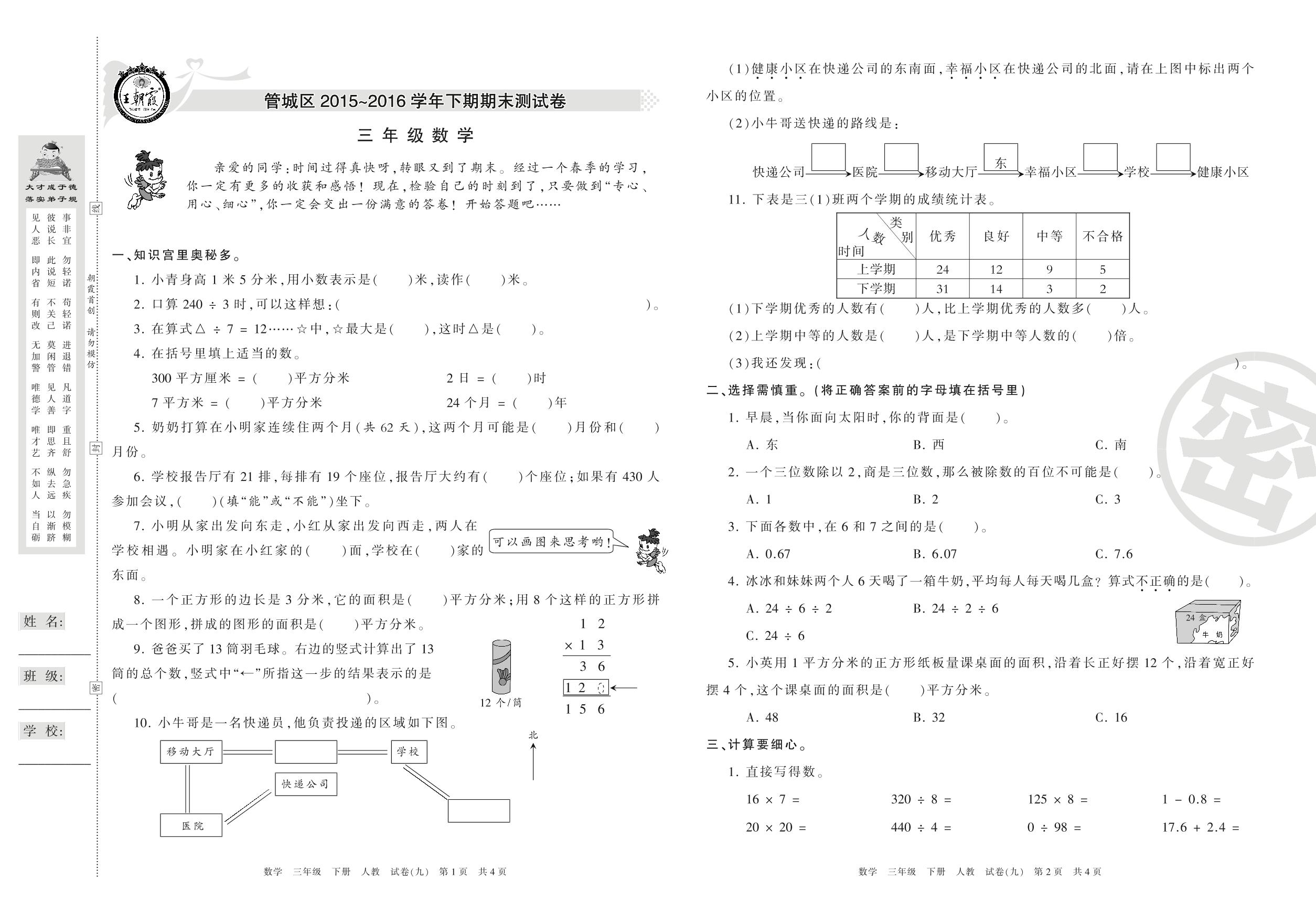 2015-2016学年第二学期郑州市管城区三年级数学试卷(人教版)【9】