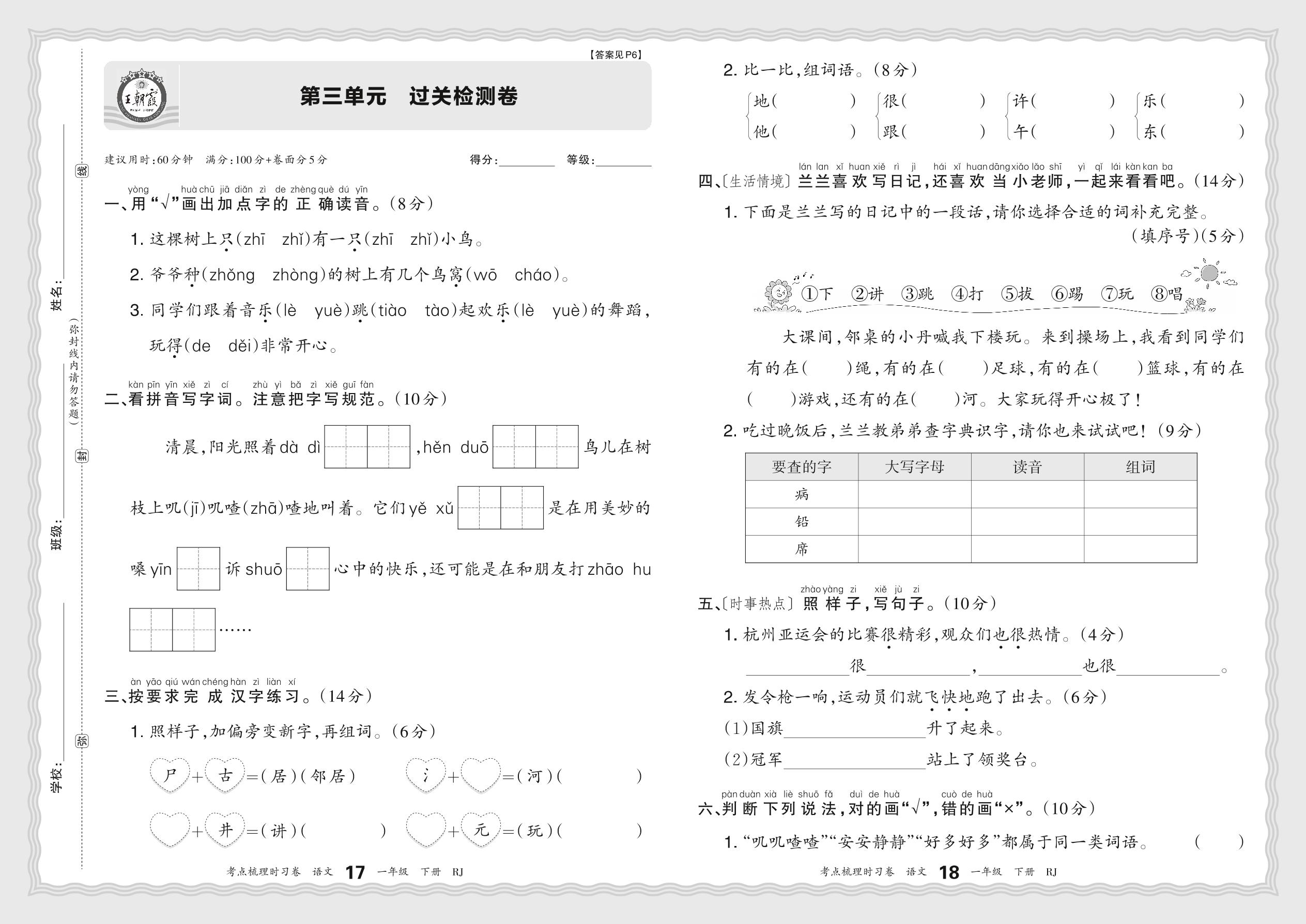 2024春下册一年级语文人教版 第三单元 过关检测卷