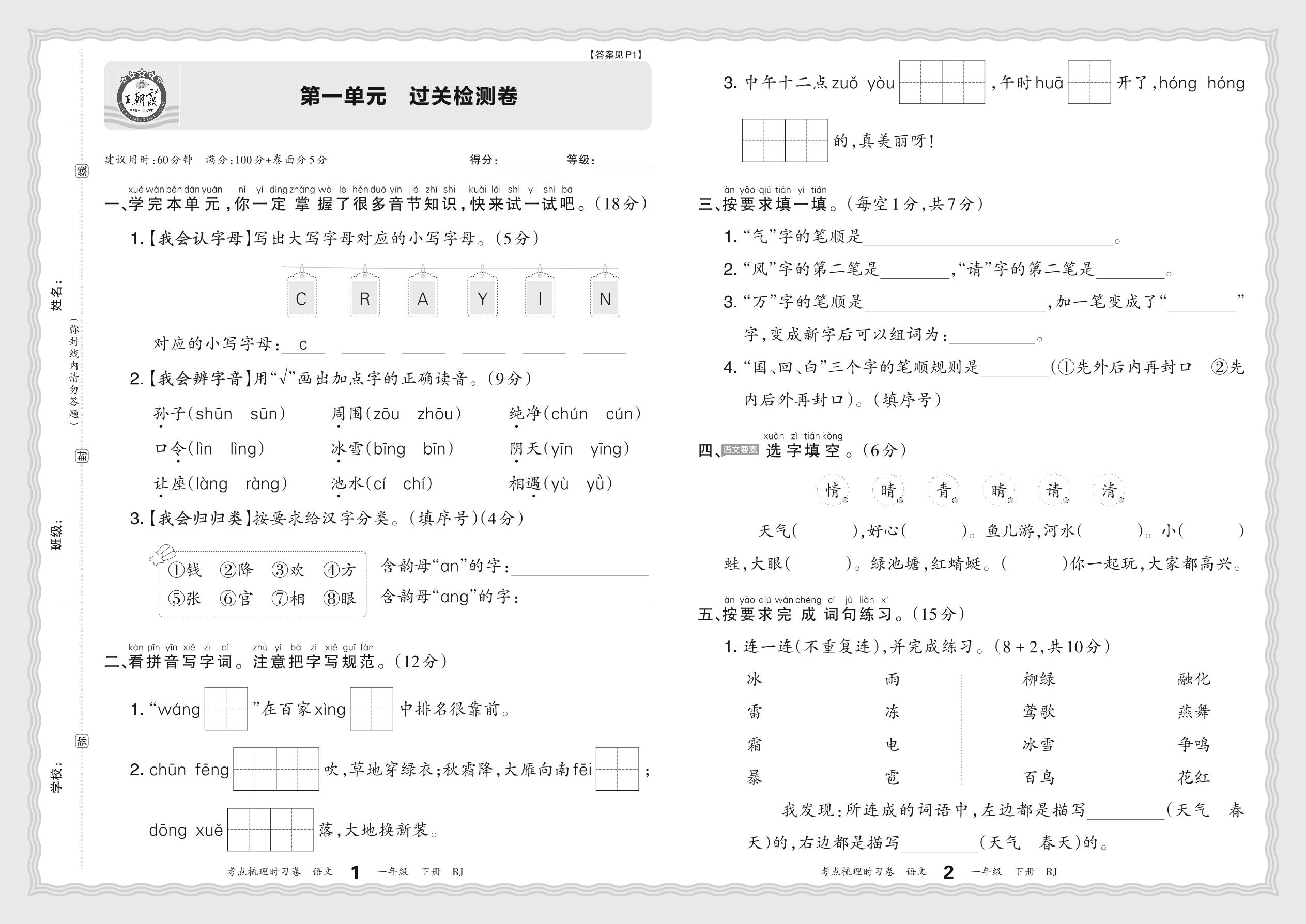 2024春下册一年级语文人教版 第一单元 过关检测卷