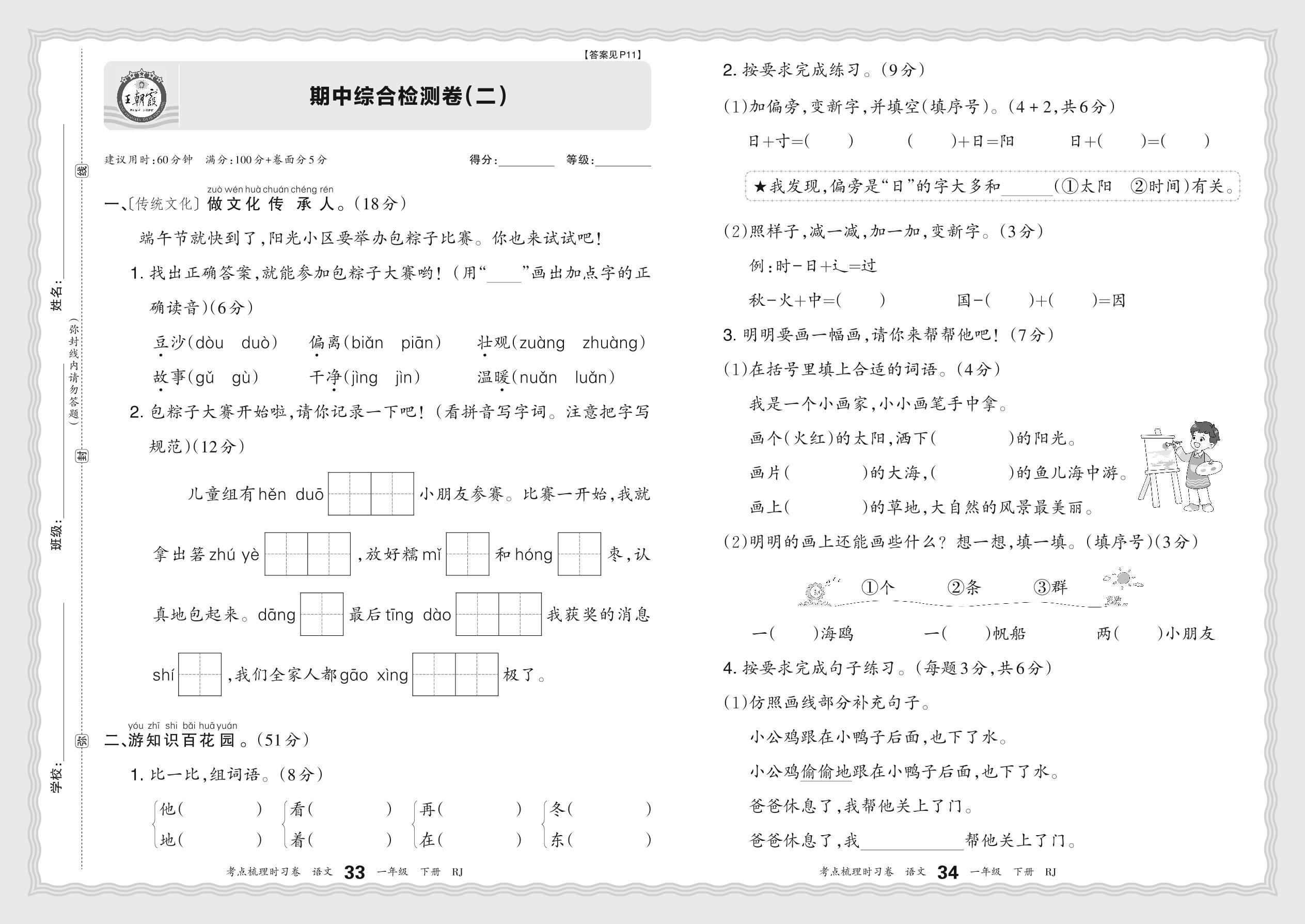 2024春下册一年级语文人教版 期中综合检测卷(二)