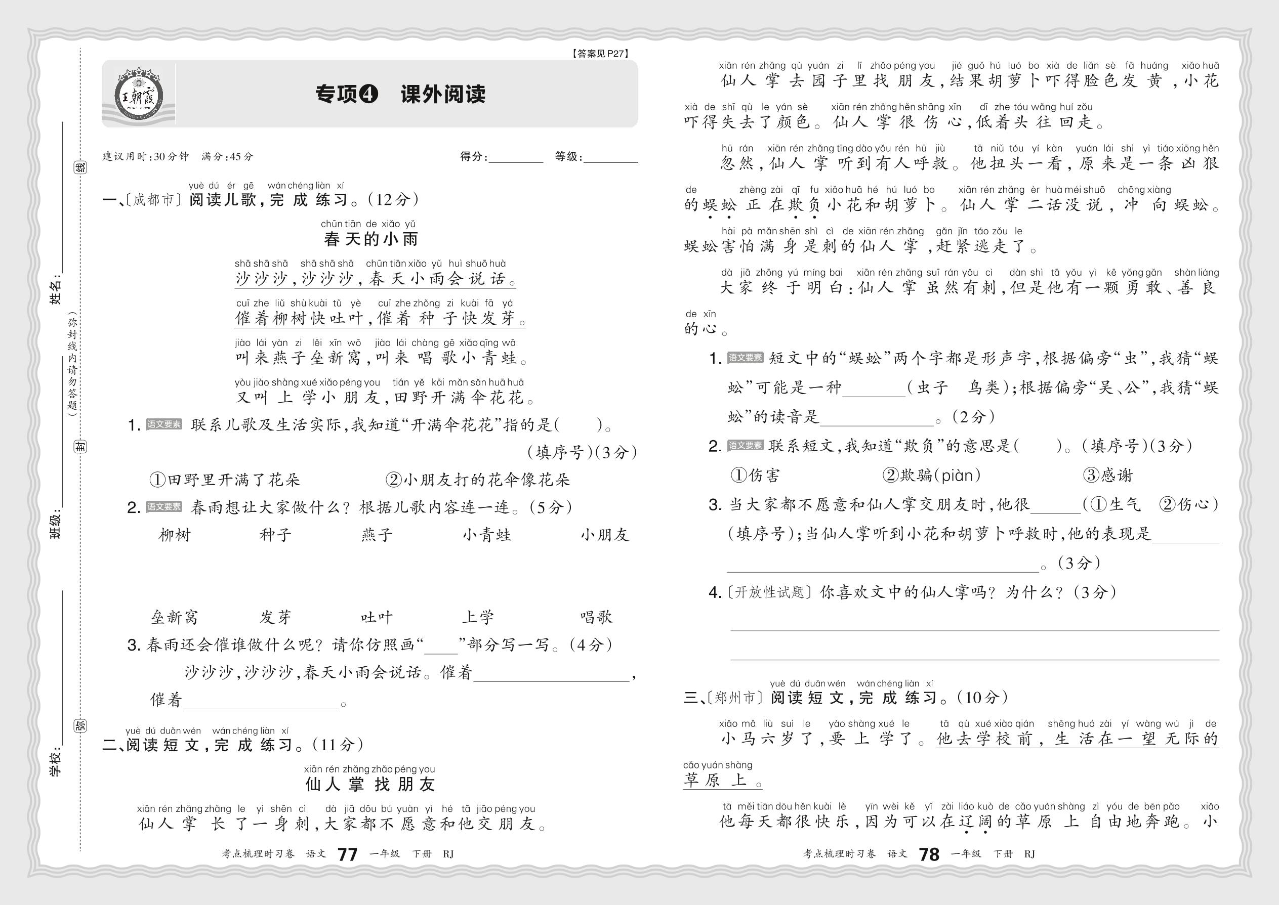 2024春下册一年级语文人教版 期末专项卷KD版·课外阅读【4】