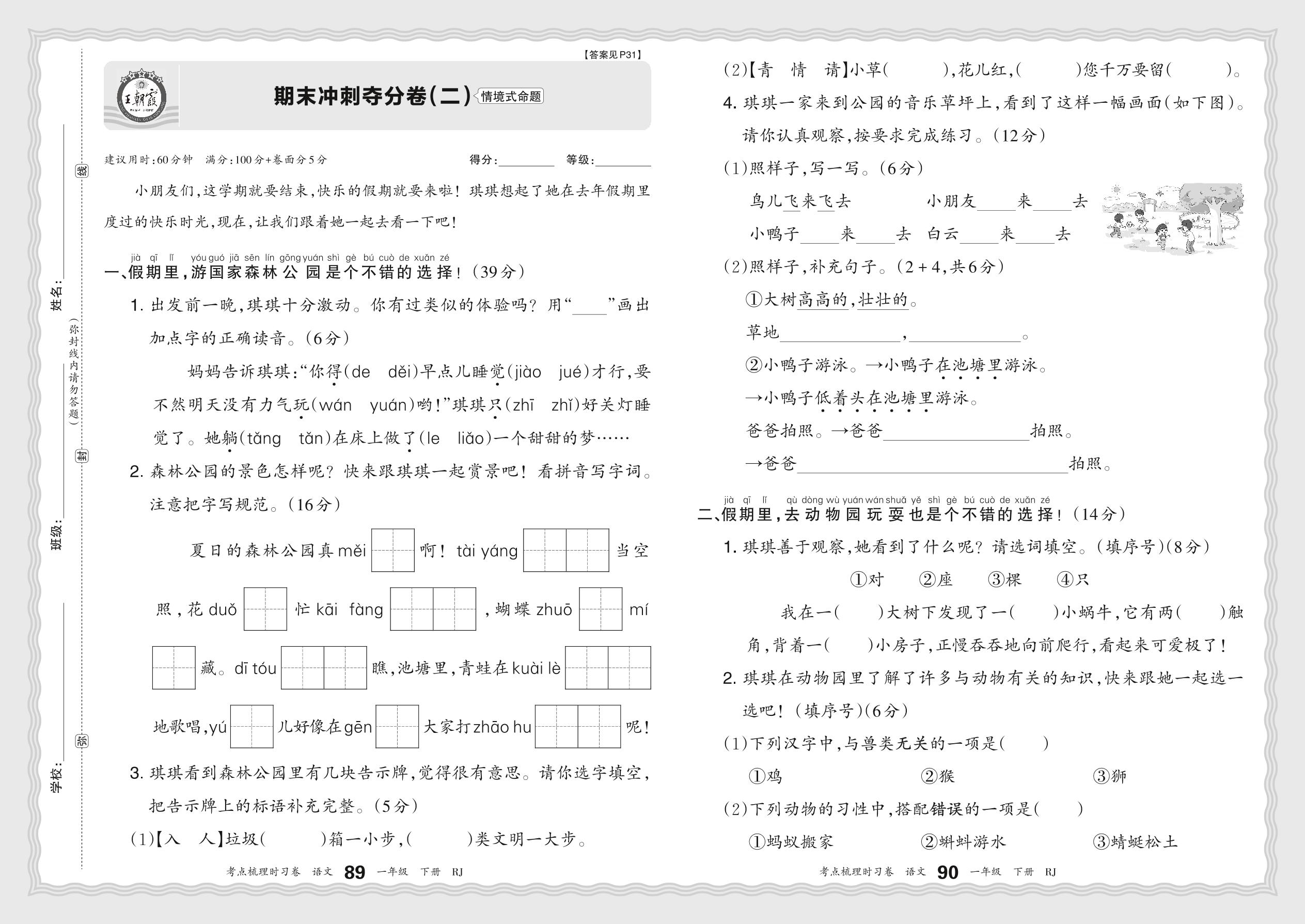 2024春下册一年级语文人教版 期末冲刺夺分卷(二)