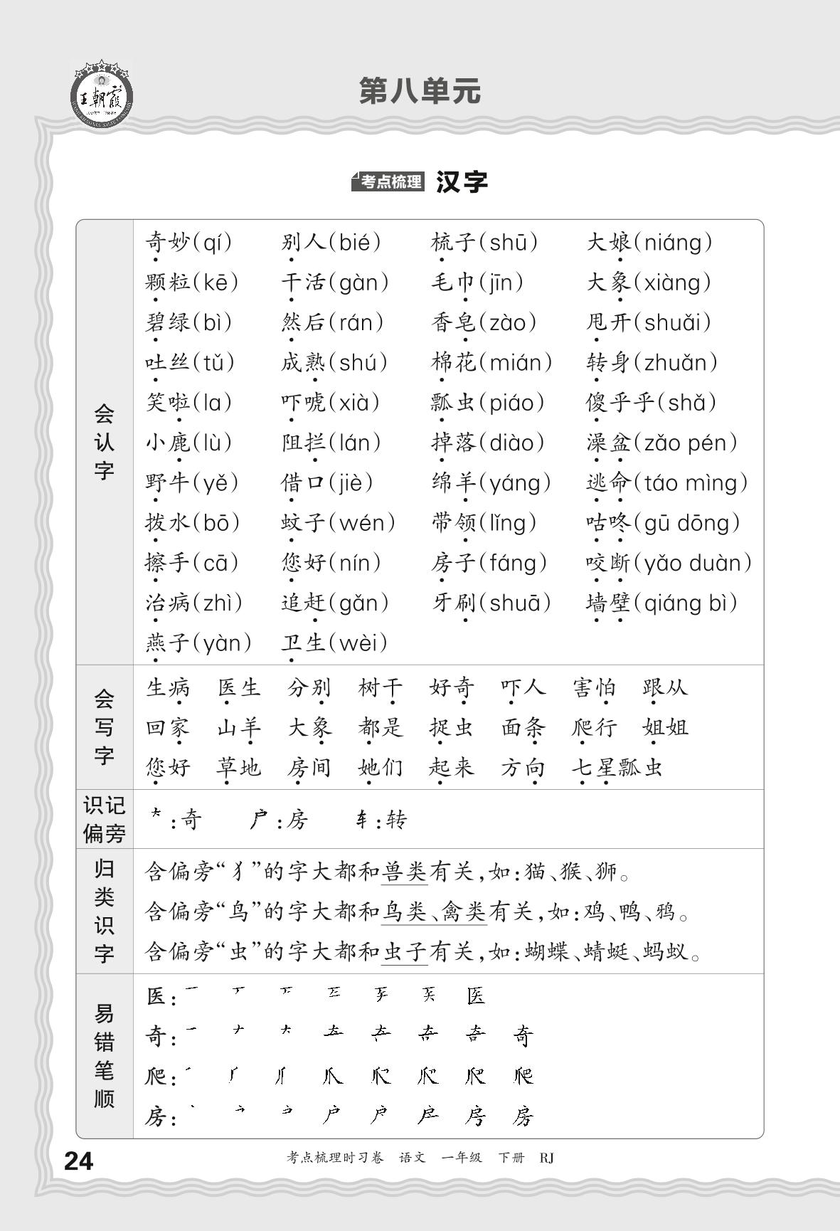 2024春下册一年级语文人教版 考点梳理手册——第八单元