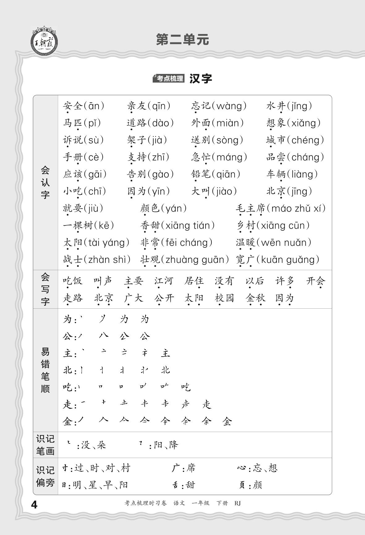 2024春下册一年级语文人教版 考点梳理手册——第二单元
