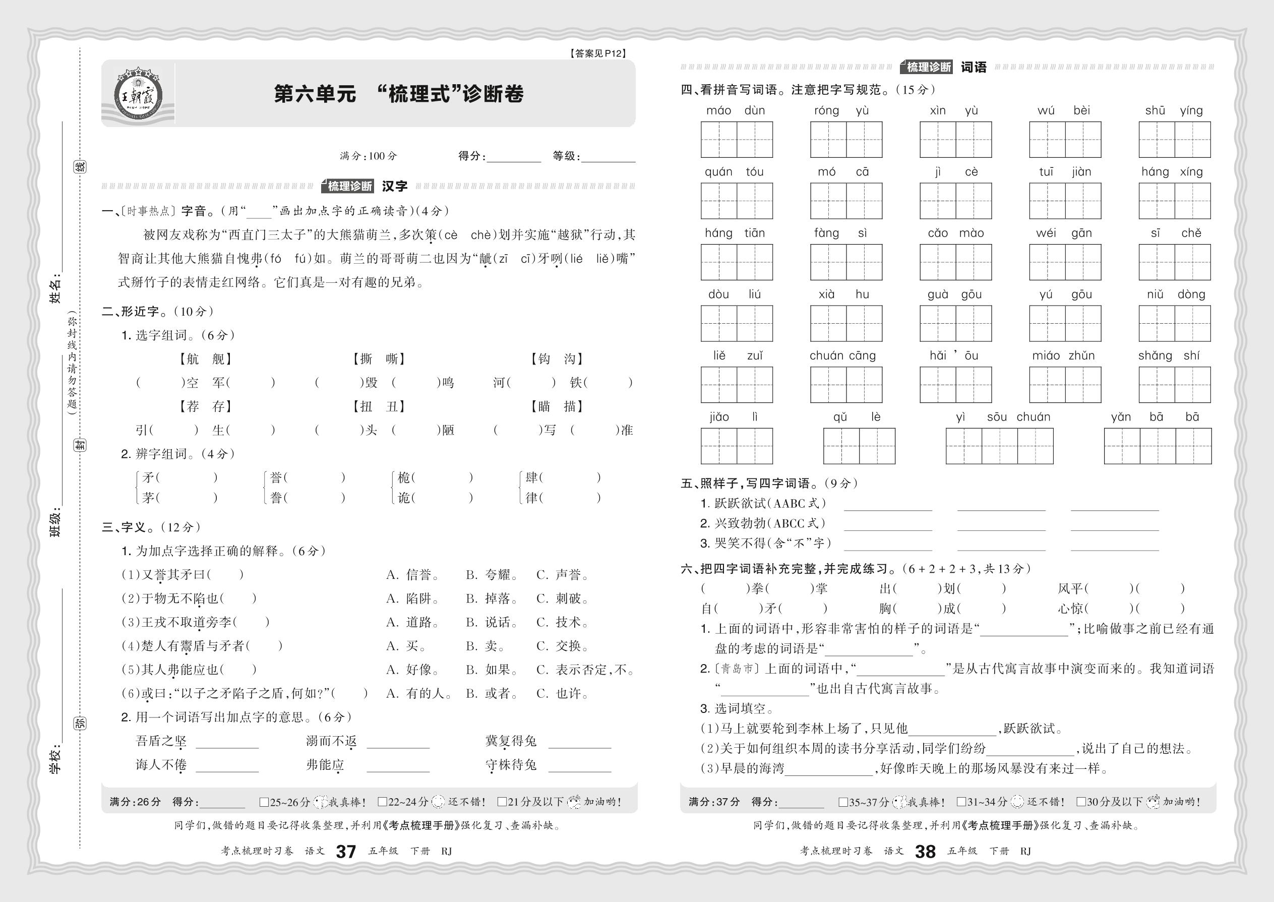 2024春下册五年级语文人教版 第六单元 “梳理式”诊断卷