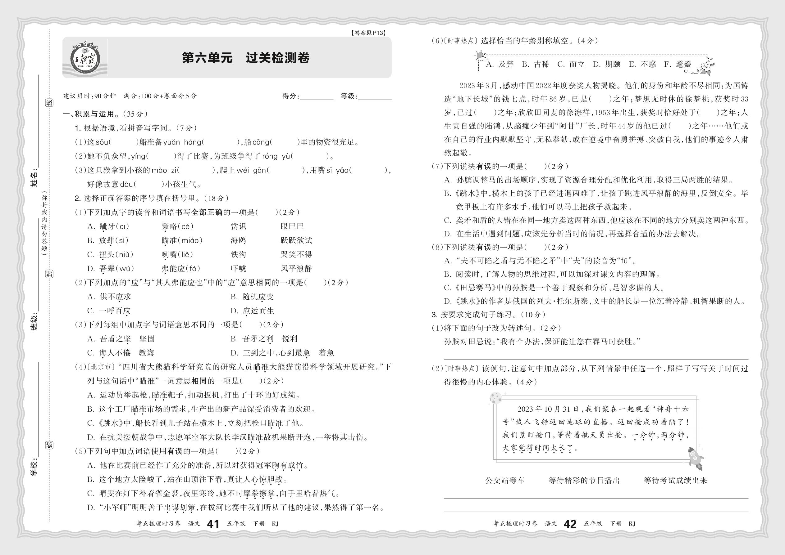 2024春下册五年级语文人教版 第六单元 过关检测卷