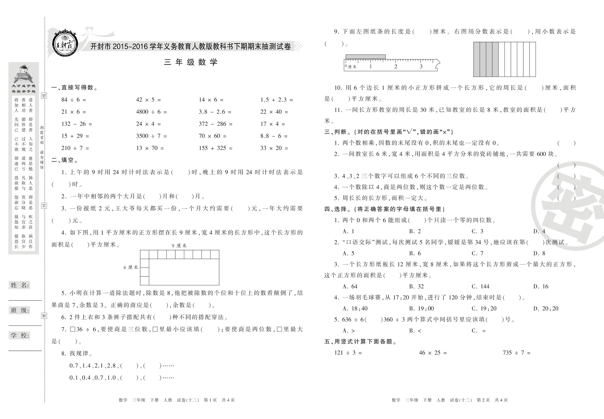 2015-2016学年第二学期开封市三年级数学试卷(人教版)【12】