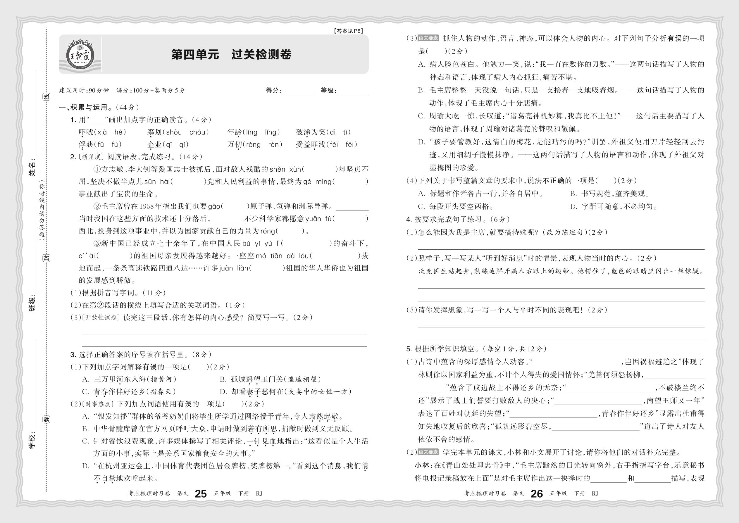 2024春下册五年级语文人教版 第四单元 过关检测卷