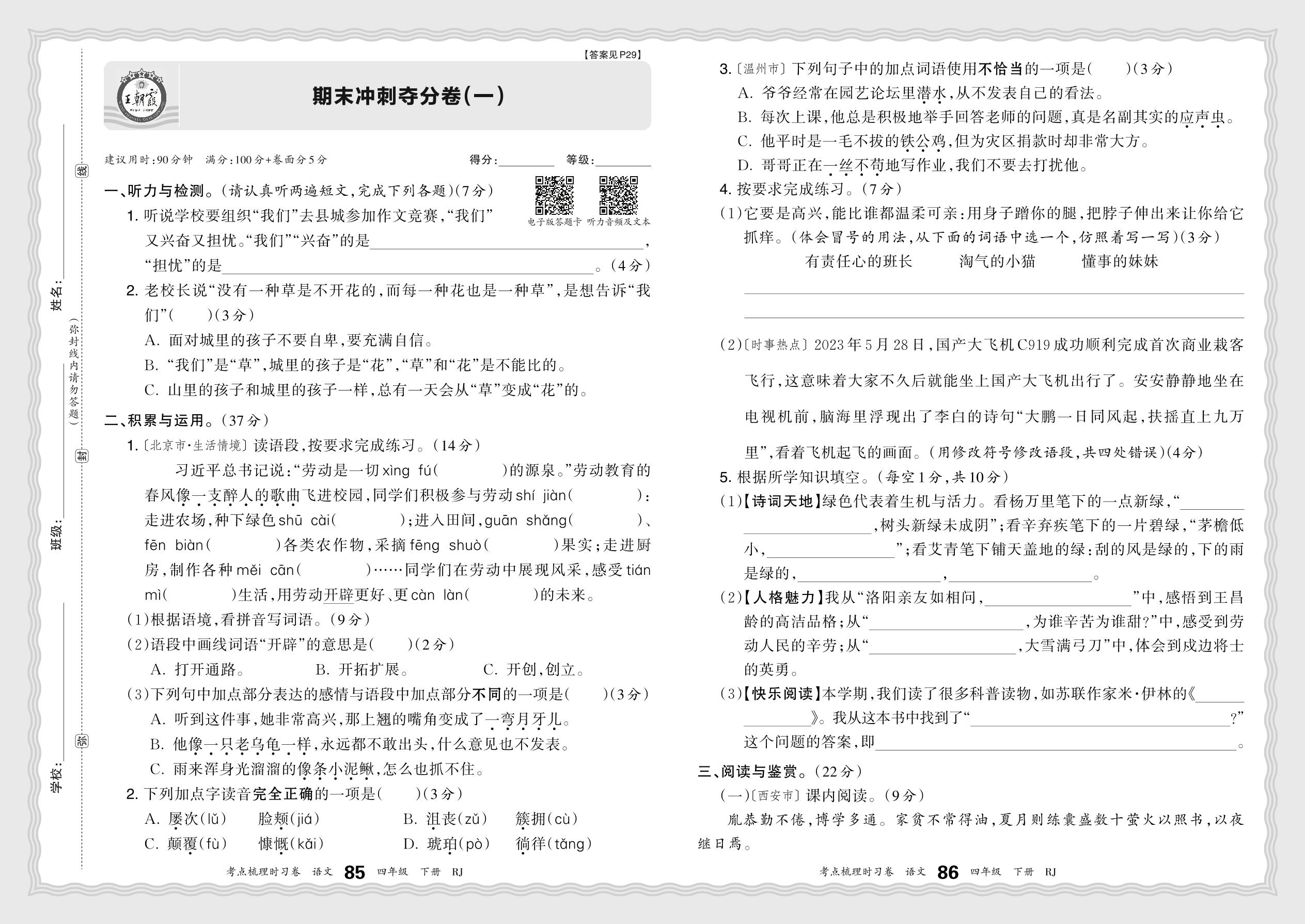 四年级语文人教版下册期末卷