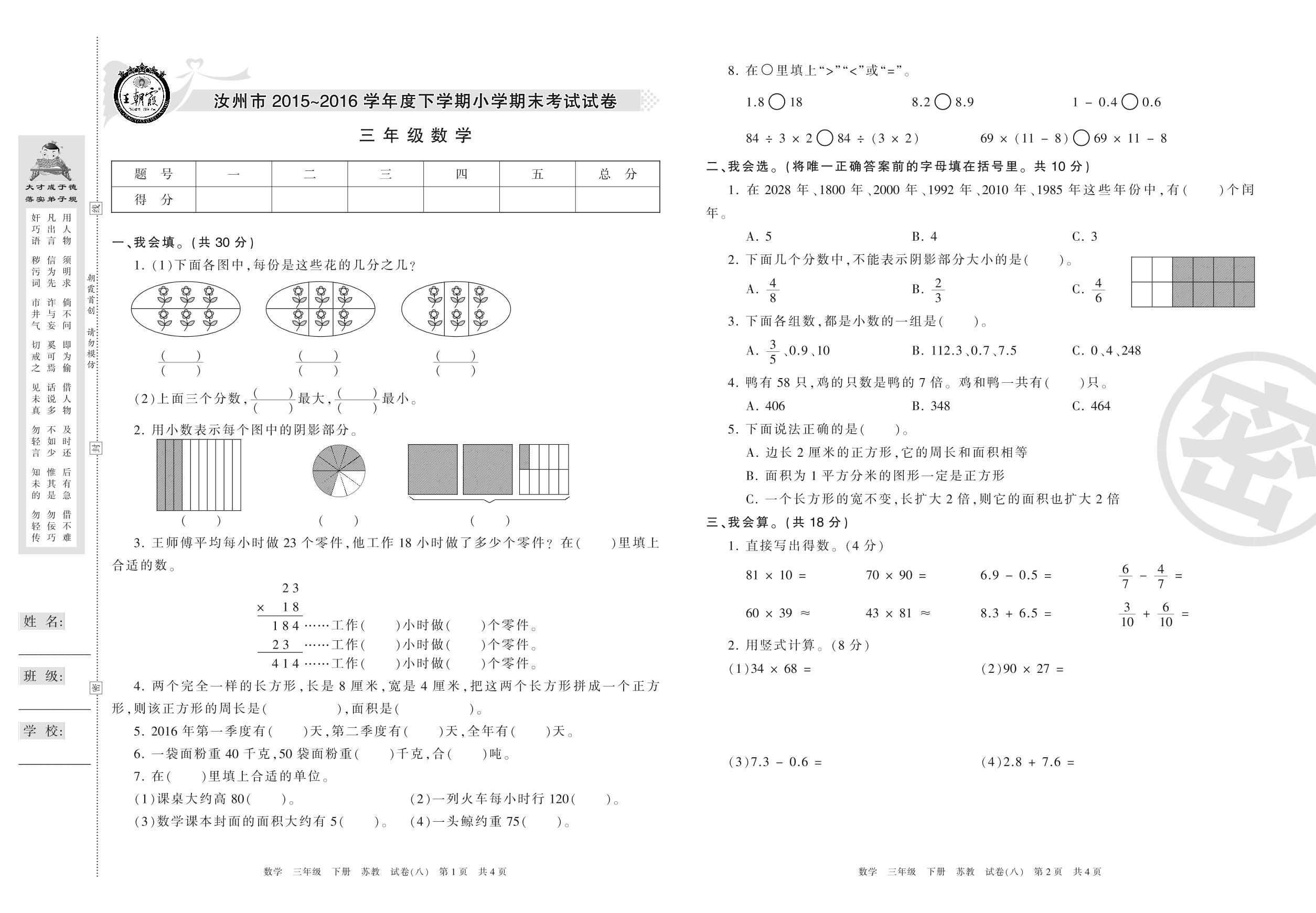 2015-2016学年第二学期汝州市三年级数学试卷(苏教版)【8】