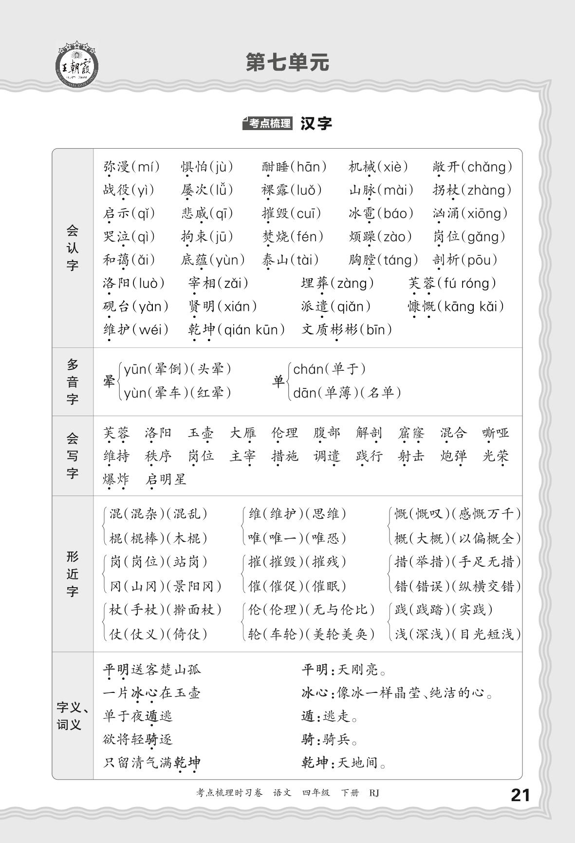 2024春下册四年级语文人教版 考点梳理手册——第七单元