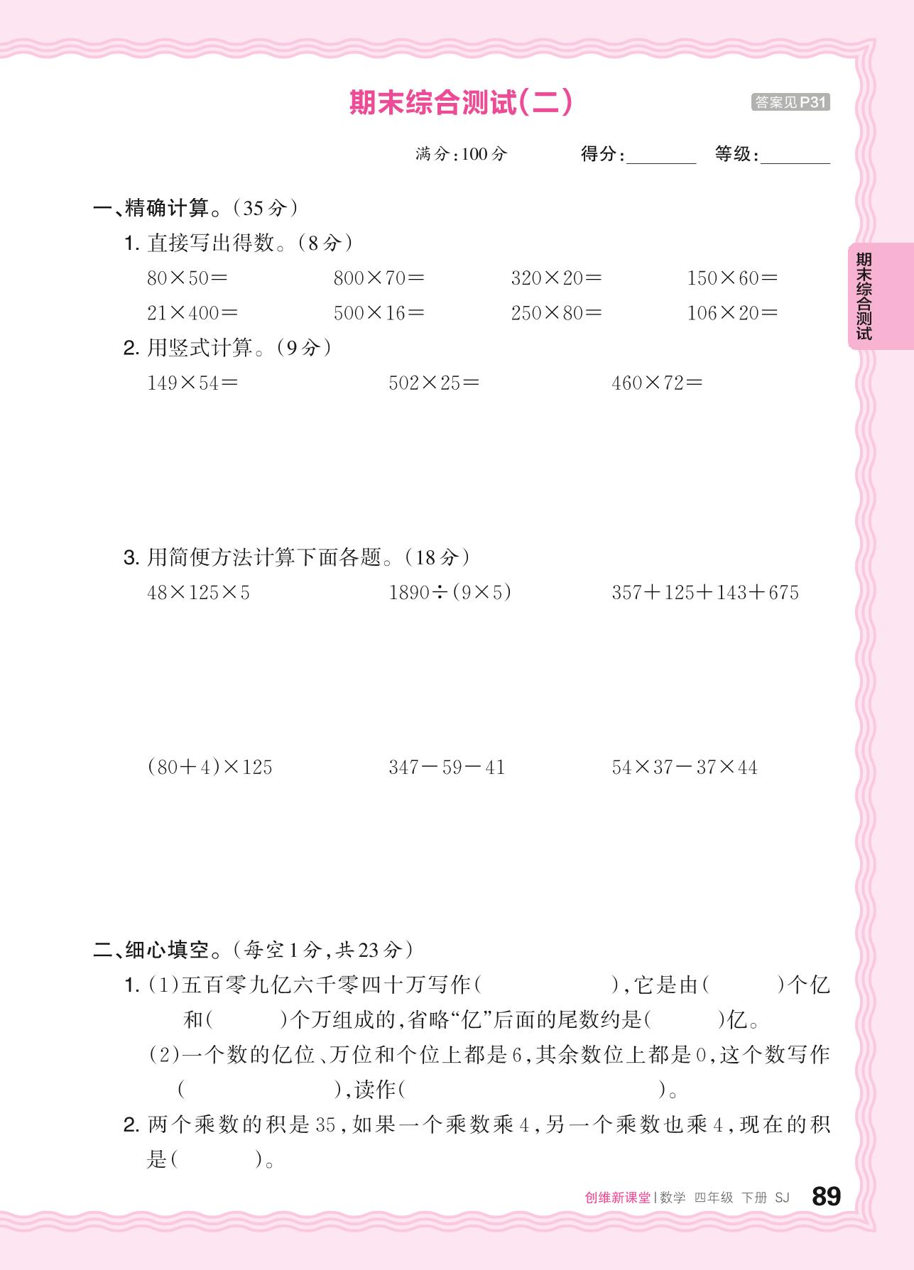 2024春下册四年级数学苏教版 期末综合测试(二)