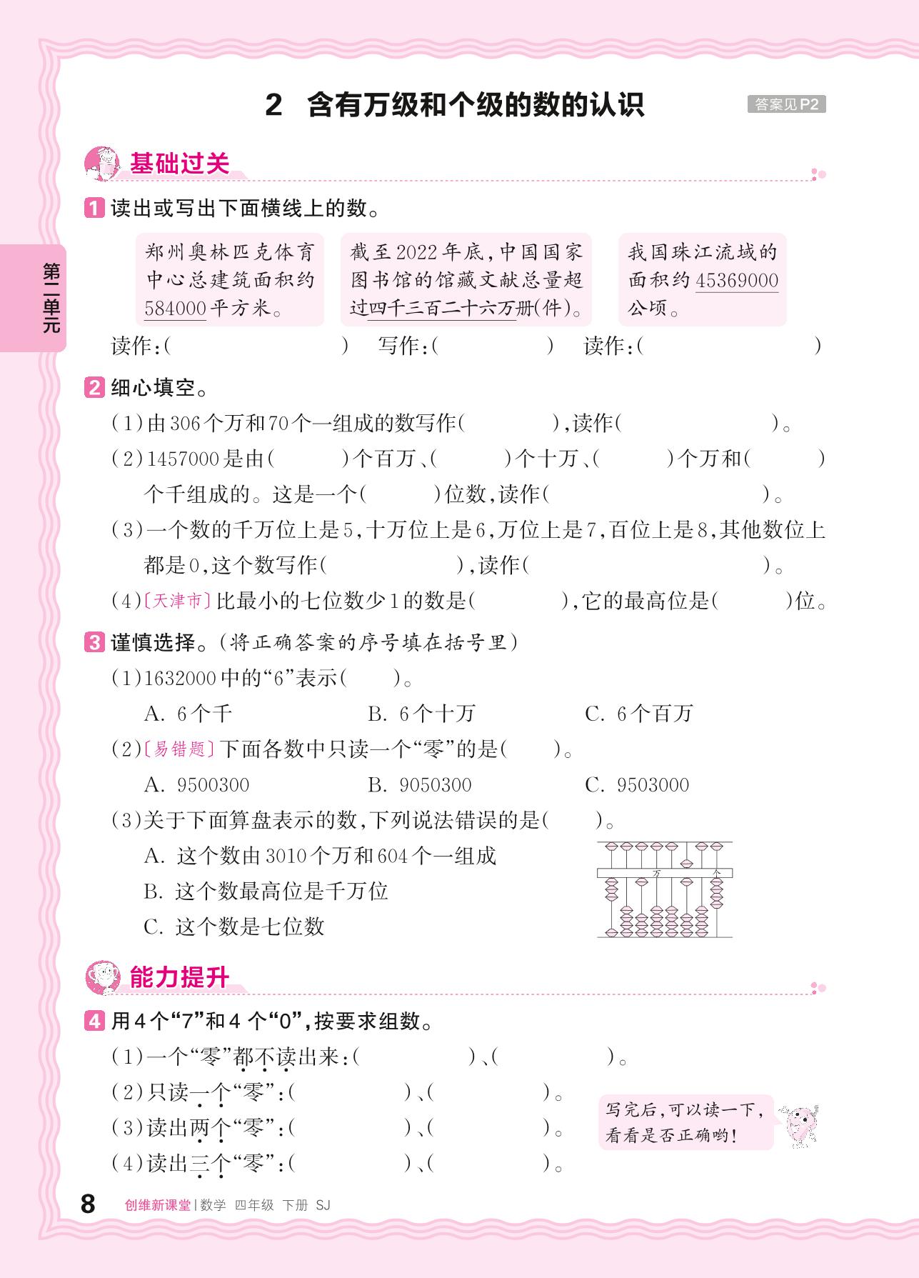 2024春下册四年级数学苏教版 第二单元 认识多位数——2. 含有万级和个级的数的认识