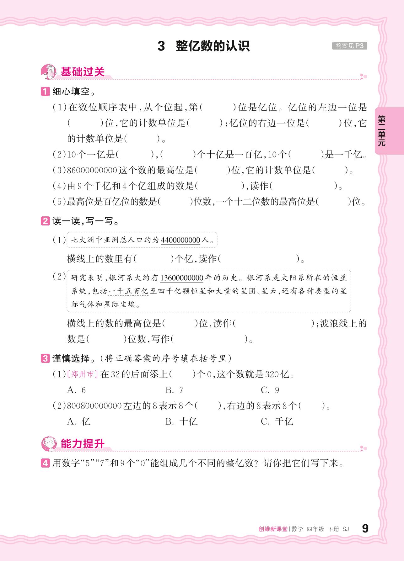2024春下册四年级数学苏教版 第二单元 认识多位数——3. 整亿数的认识