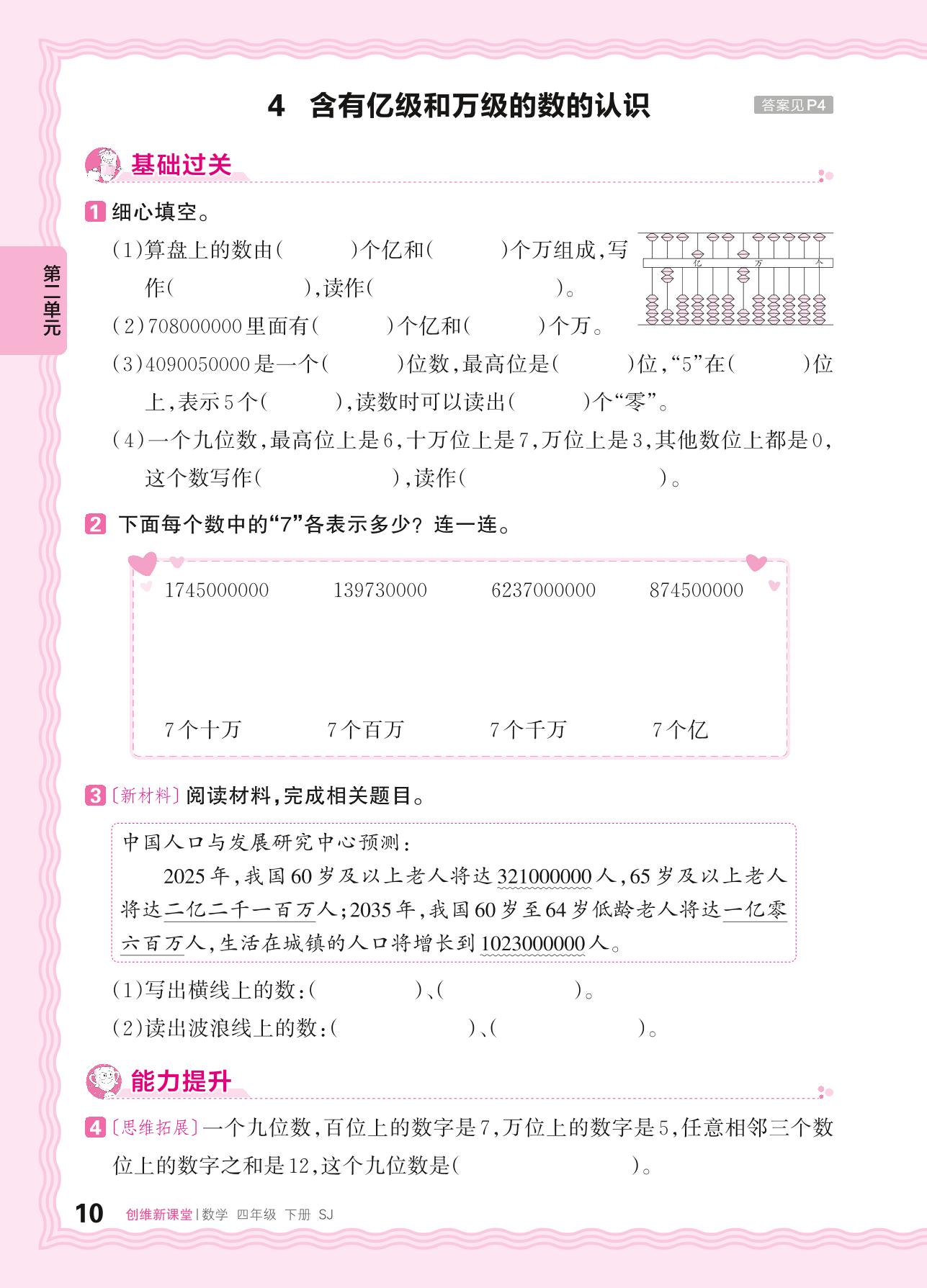 2024春下册四年级数学苏教版 第二单元 认识多位数——4. 含有亿级和万级的数的认识