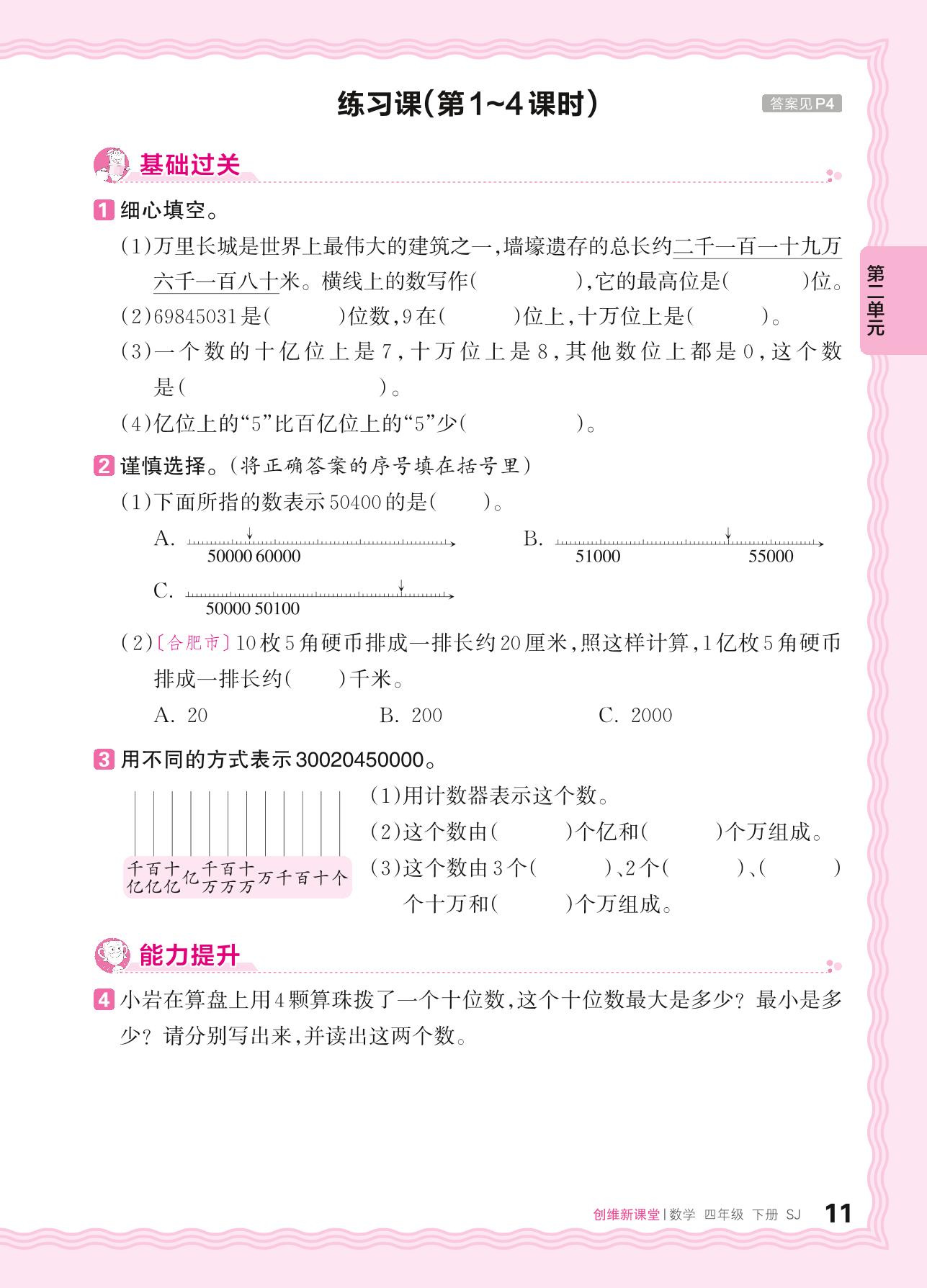 2024春下册四年级数学苏教版 第二单元 认识多位数——整万数、含有万级和个级的数、整亿数、含有亿级和万级的数的认识练习课