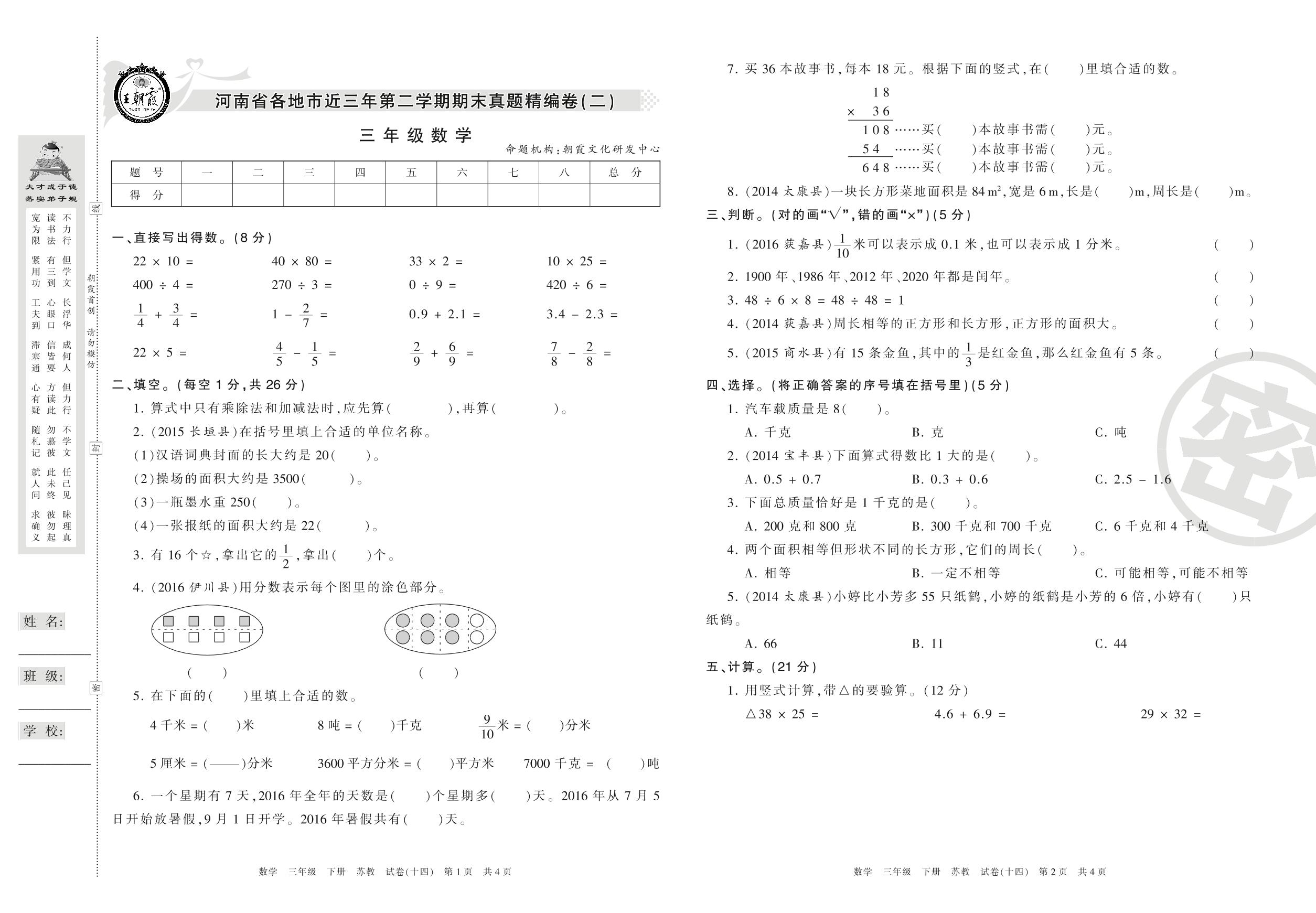 河南省近三年精编(二)三年级下册数学(苏教版)【14】