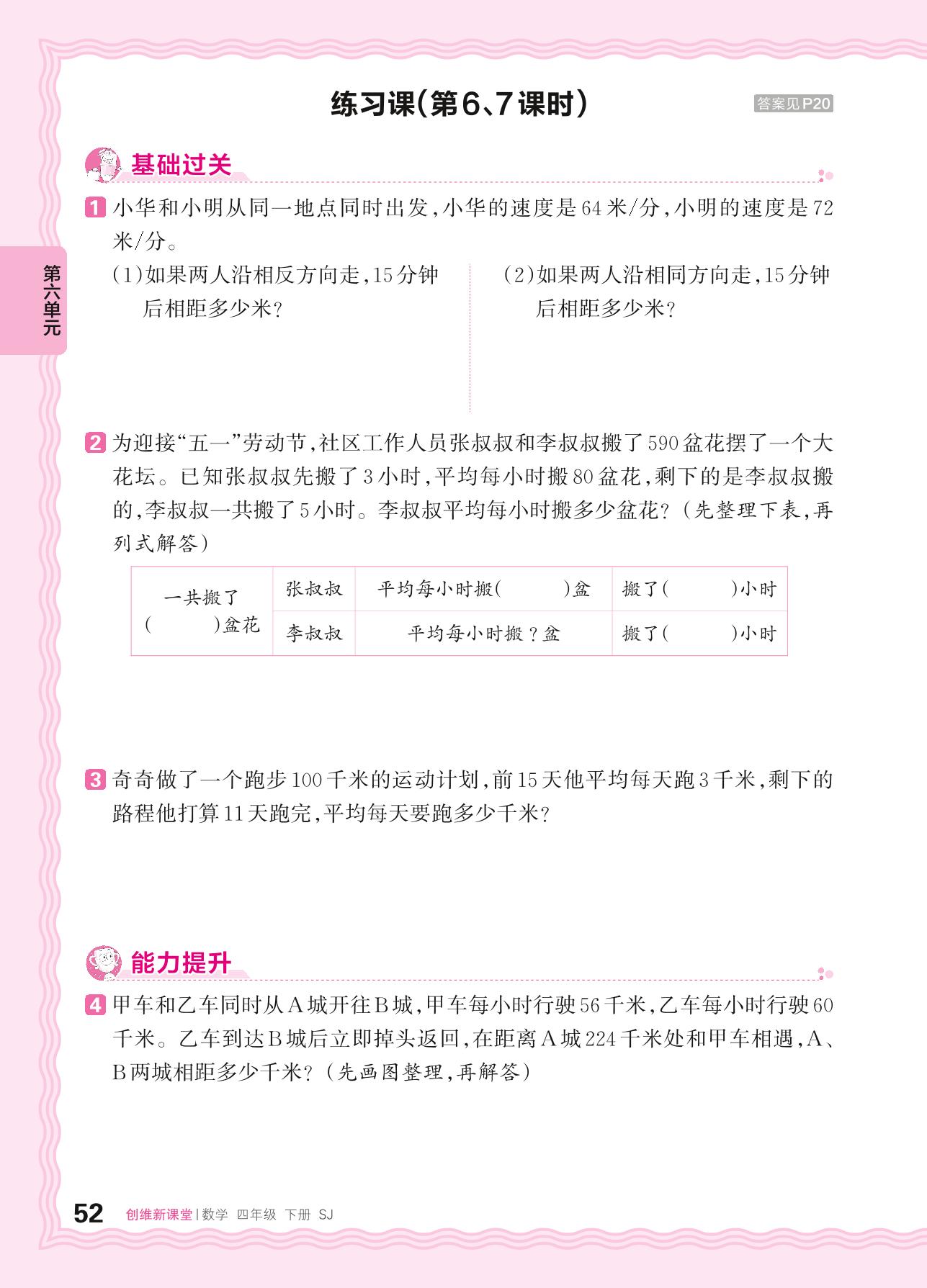 2024春下册四年级数学苏教版 第六单元 运算律——相遇问题练习课