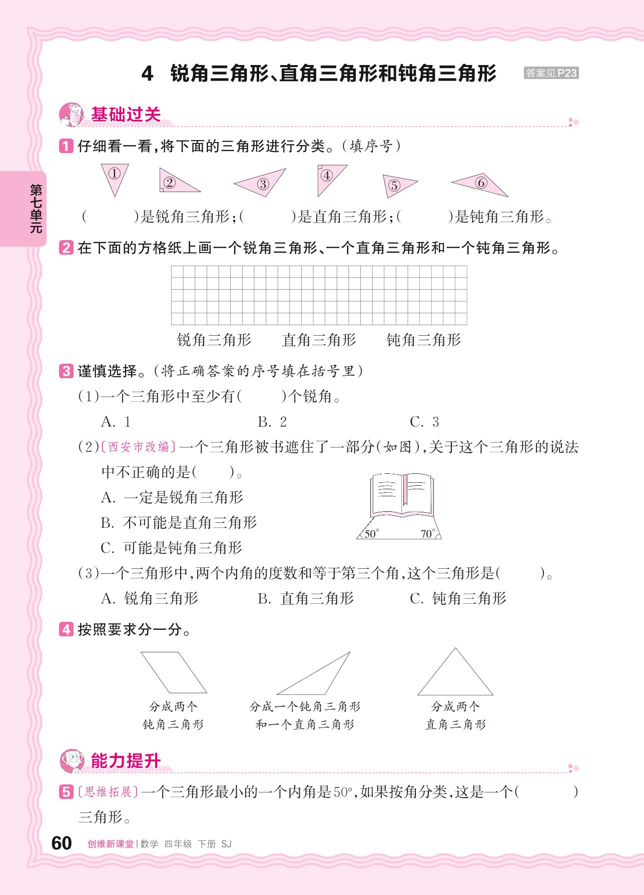 2024春下册四年级数学苏教版 第七单元 三角形、平行四边形和梯形——4. 锐角三角形、直角三角形和钝角三角形