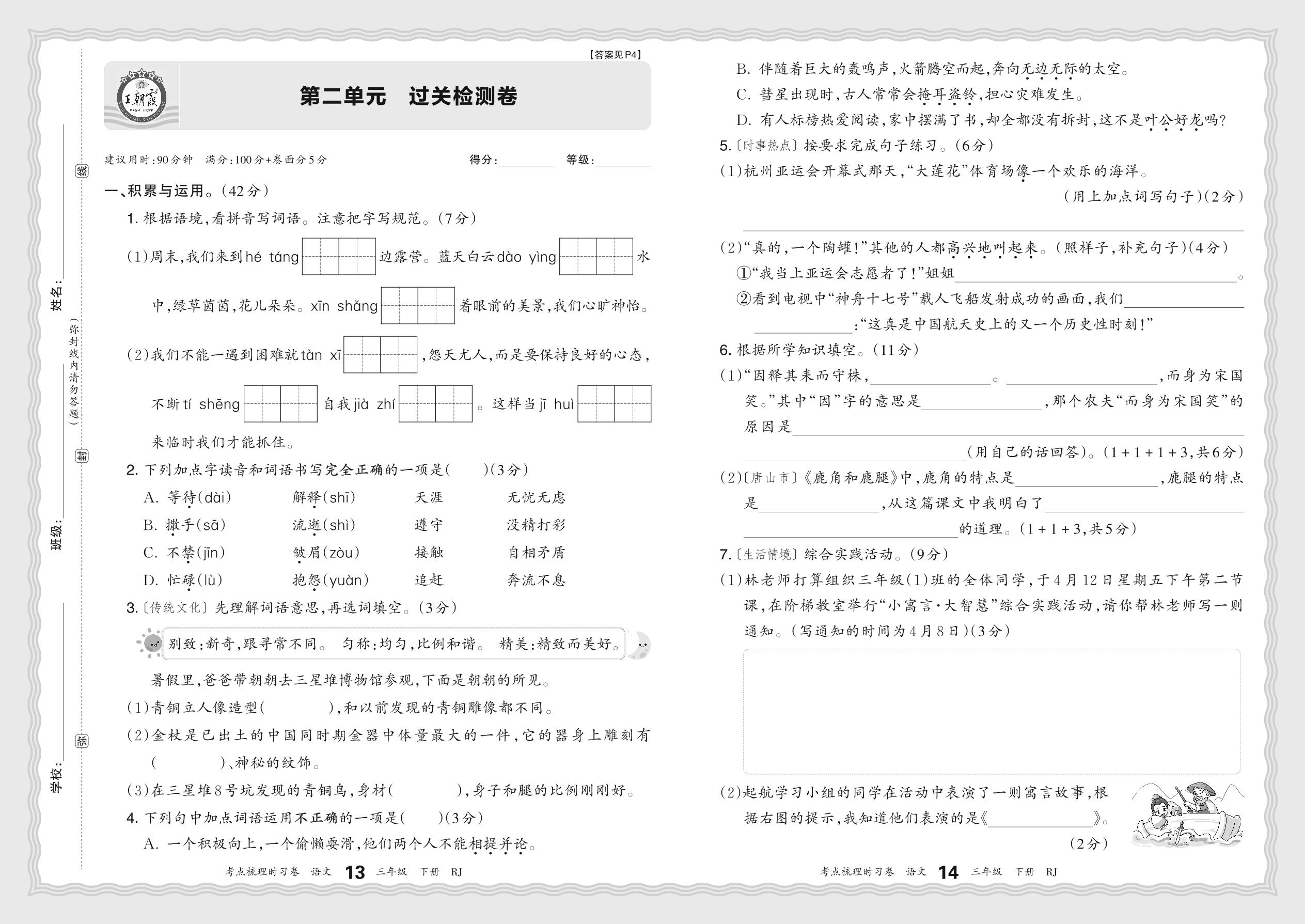 2024春下册三年级语文人教版 第二单元 过关检测卷
