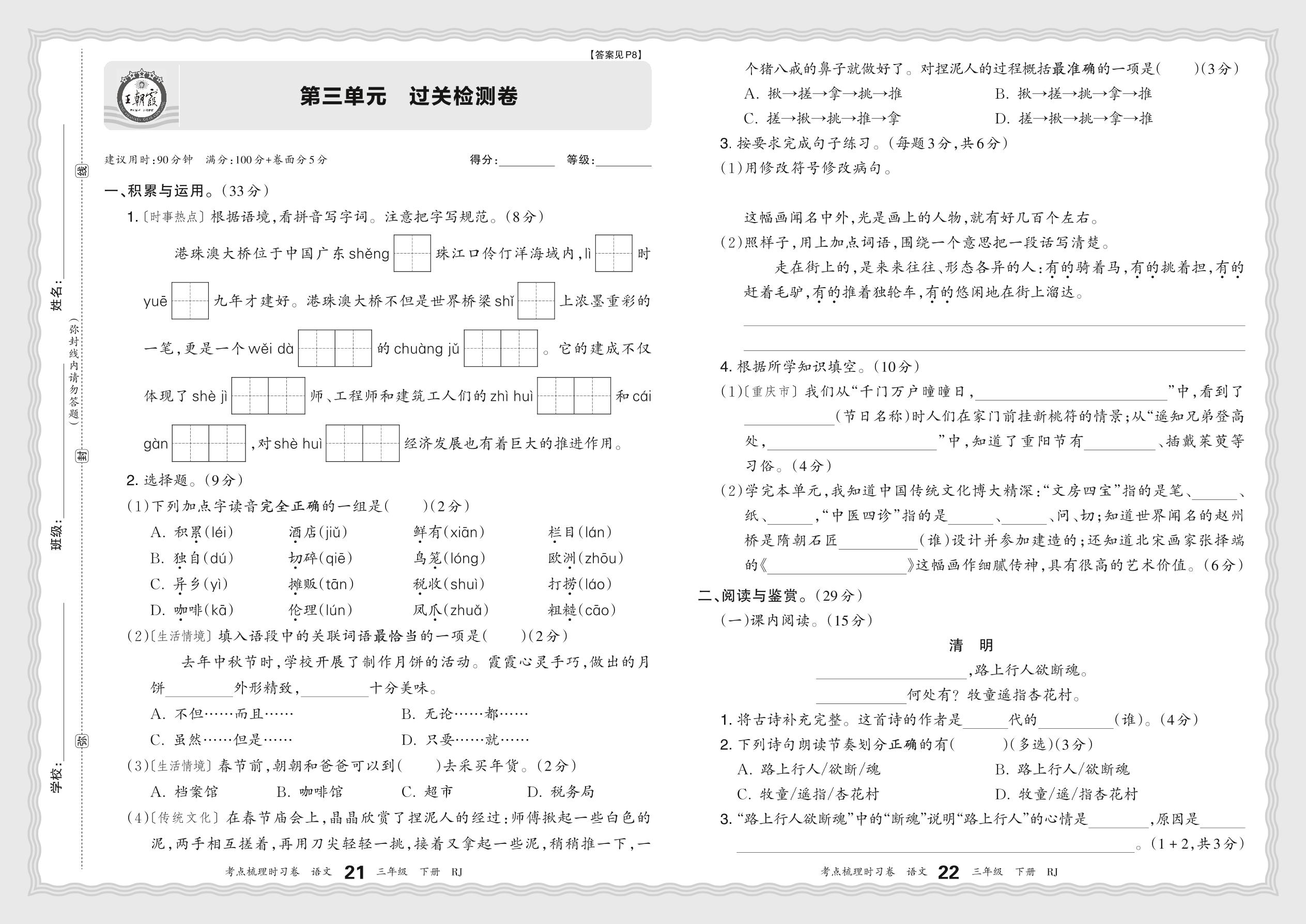 三年级语文人教版下册单元卷