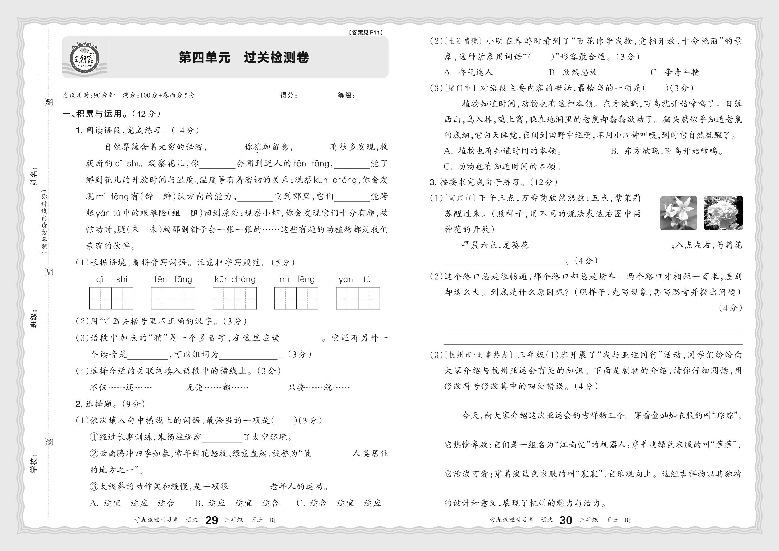 2024春下册三年级语文人教版 第四单元 过关检测卷