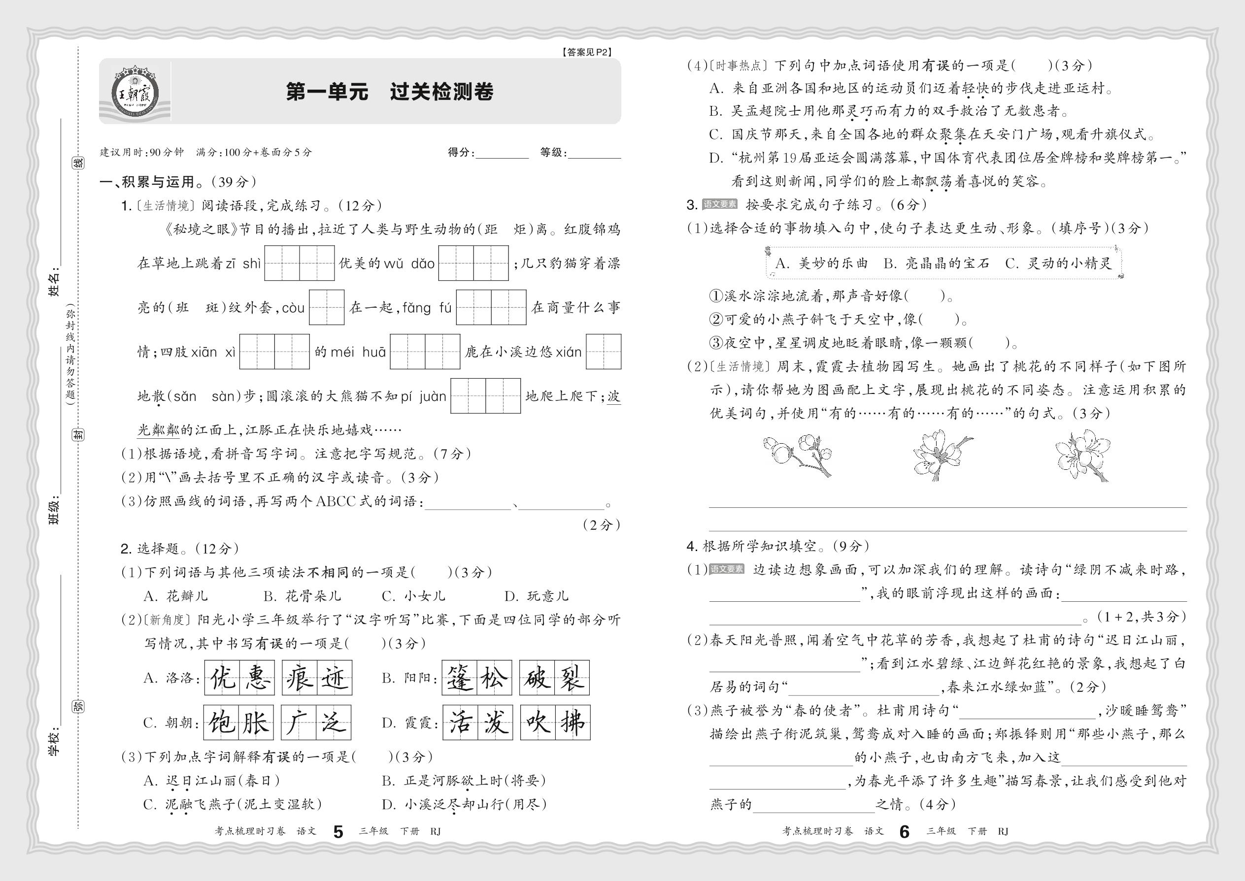 2024春下册三年级语文人教版 第一单元 过关检测卷