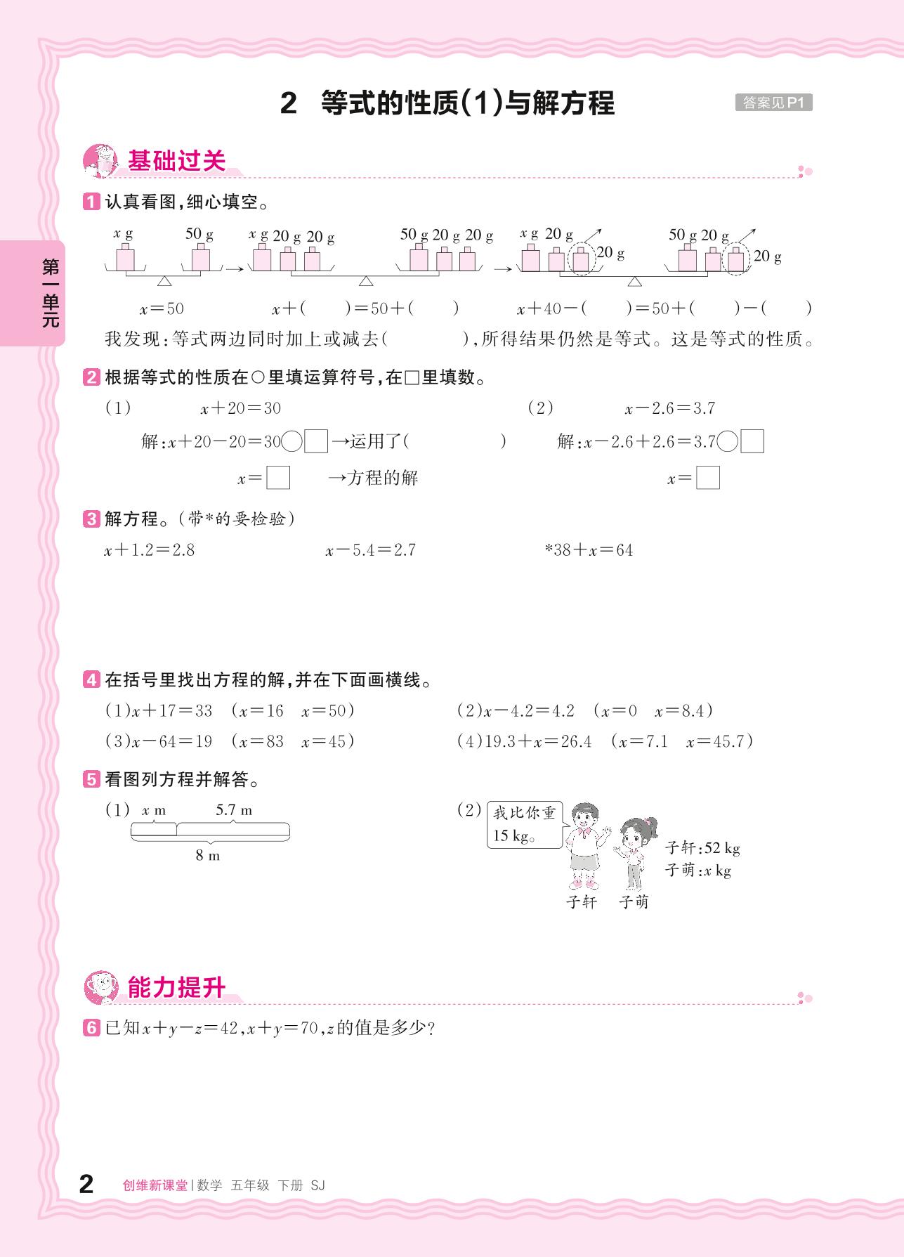 2024春下册五年级数学苏教版 第一单元 简易方程——2. 等式的性质(1)与解方程