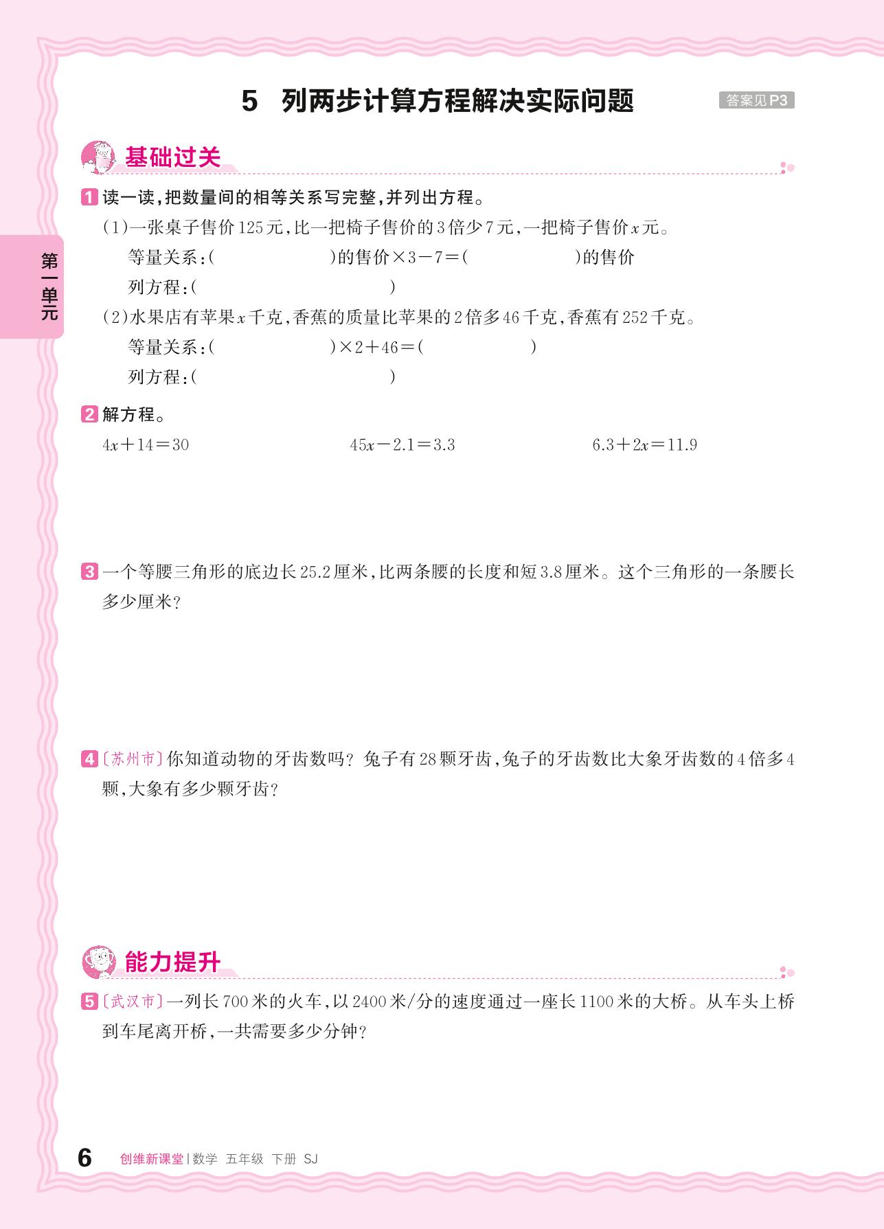2024春下册五年级数学苏教版 第一单元 简易方程——5. 列两步计算方程解决实际问题