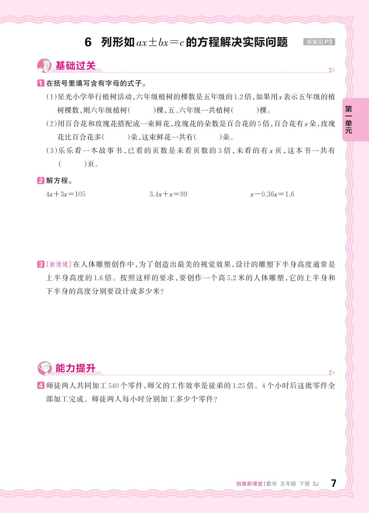2024春下册五年级数学苏教版 第一单元 简易方程——6. 列形如ax±bx=c的方程解决实际问题