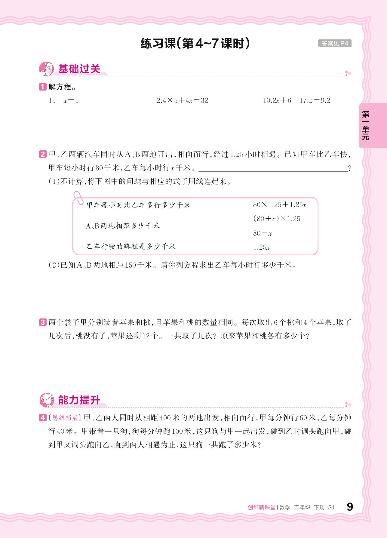2024春下册五年级数学苏教版 第一单元 简易方程——列方程解决实际问题练习课