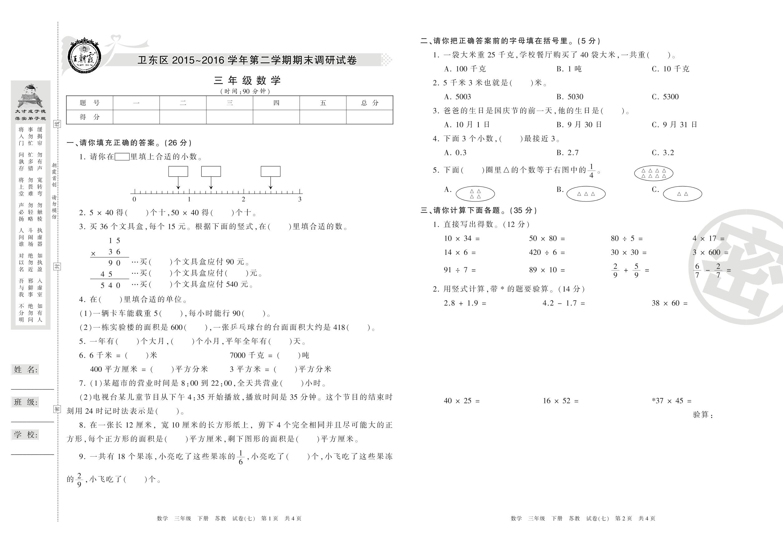 2015-2016学年第二学期卫东市三年级数学试卷(苏教版)【7】