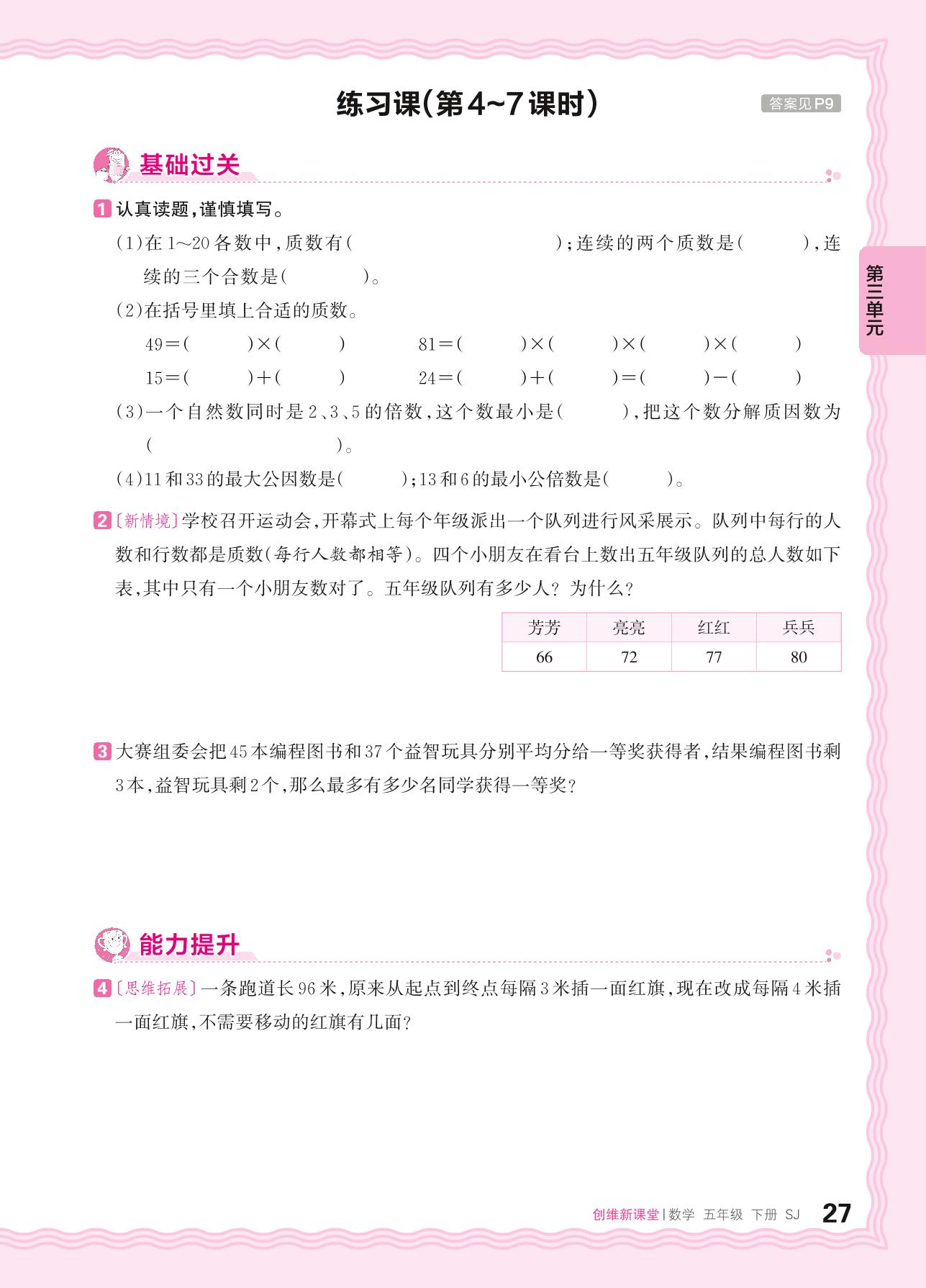 2024春下册五年级数学苏教版 第三单元 因数与倍数——质数和合数、质因数和分解质因数、公因数、公倍数练习课
