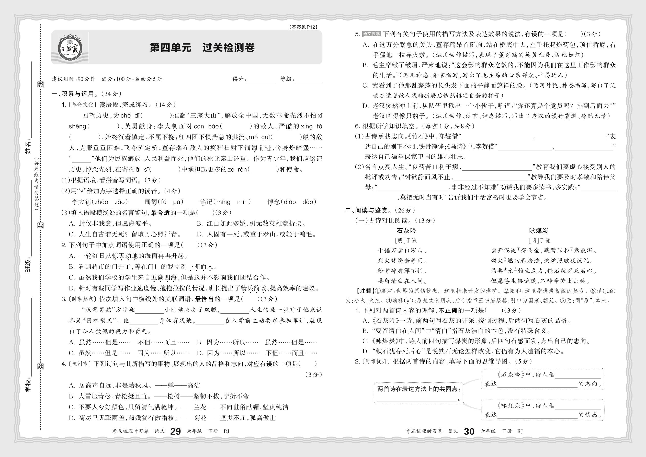 2024春下册六年级语文人教版 第四单元 过关检测卷