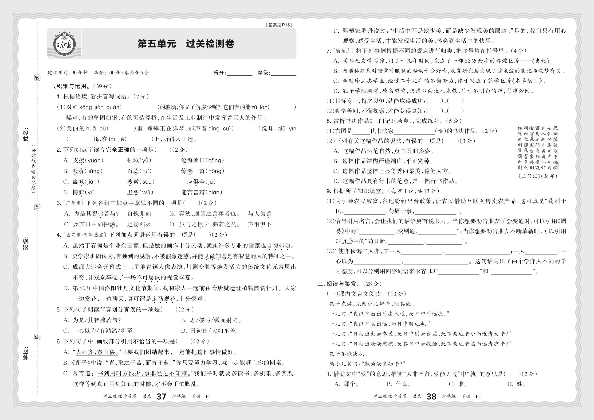 2024春下册六年级语文人教版 第五单元 过关检测卷
