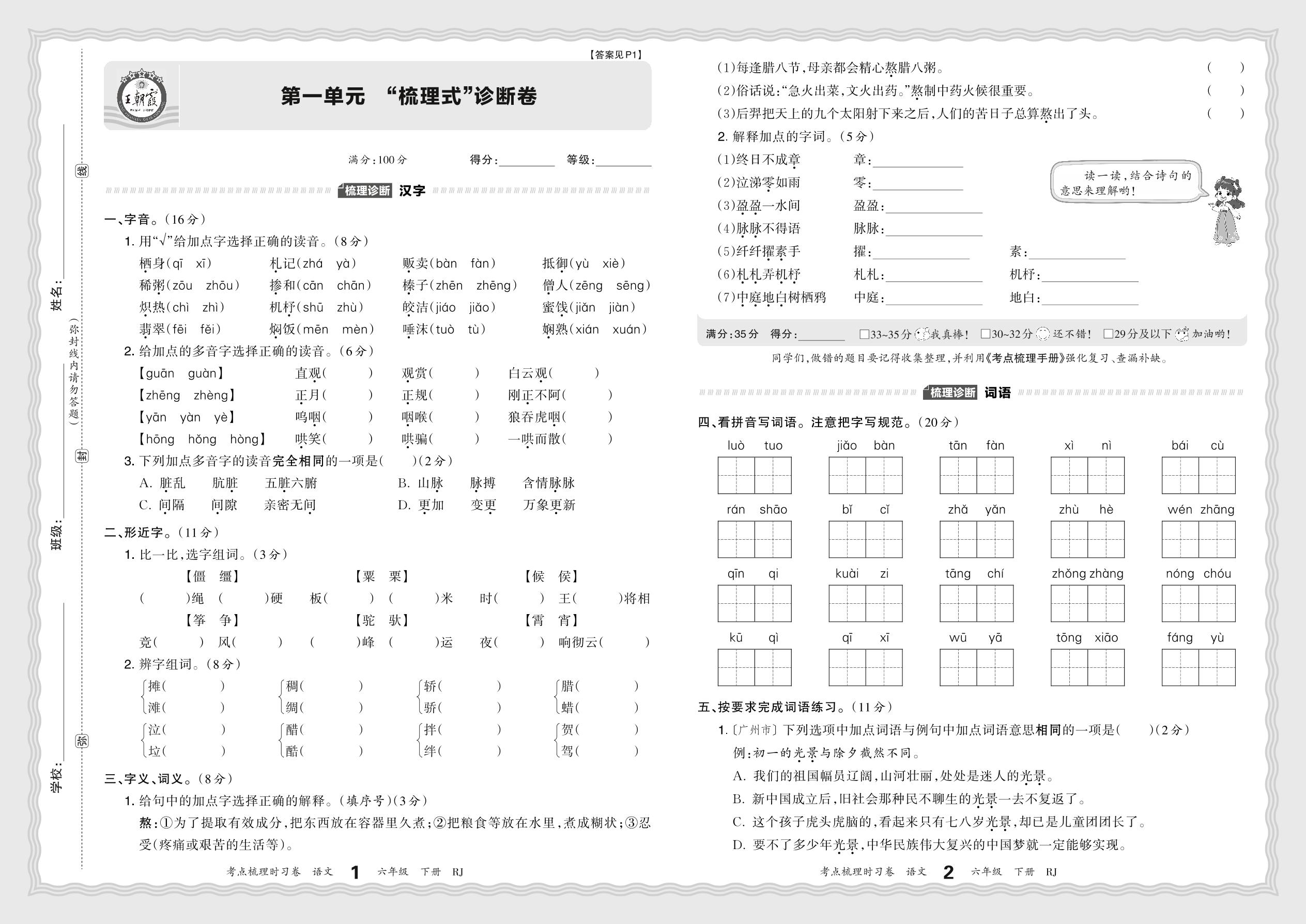 2024春下册六年级语文人教版 第一单元 “梳理式”诊断卷
