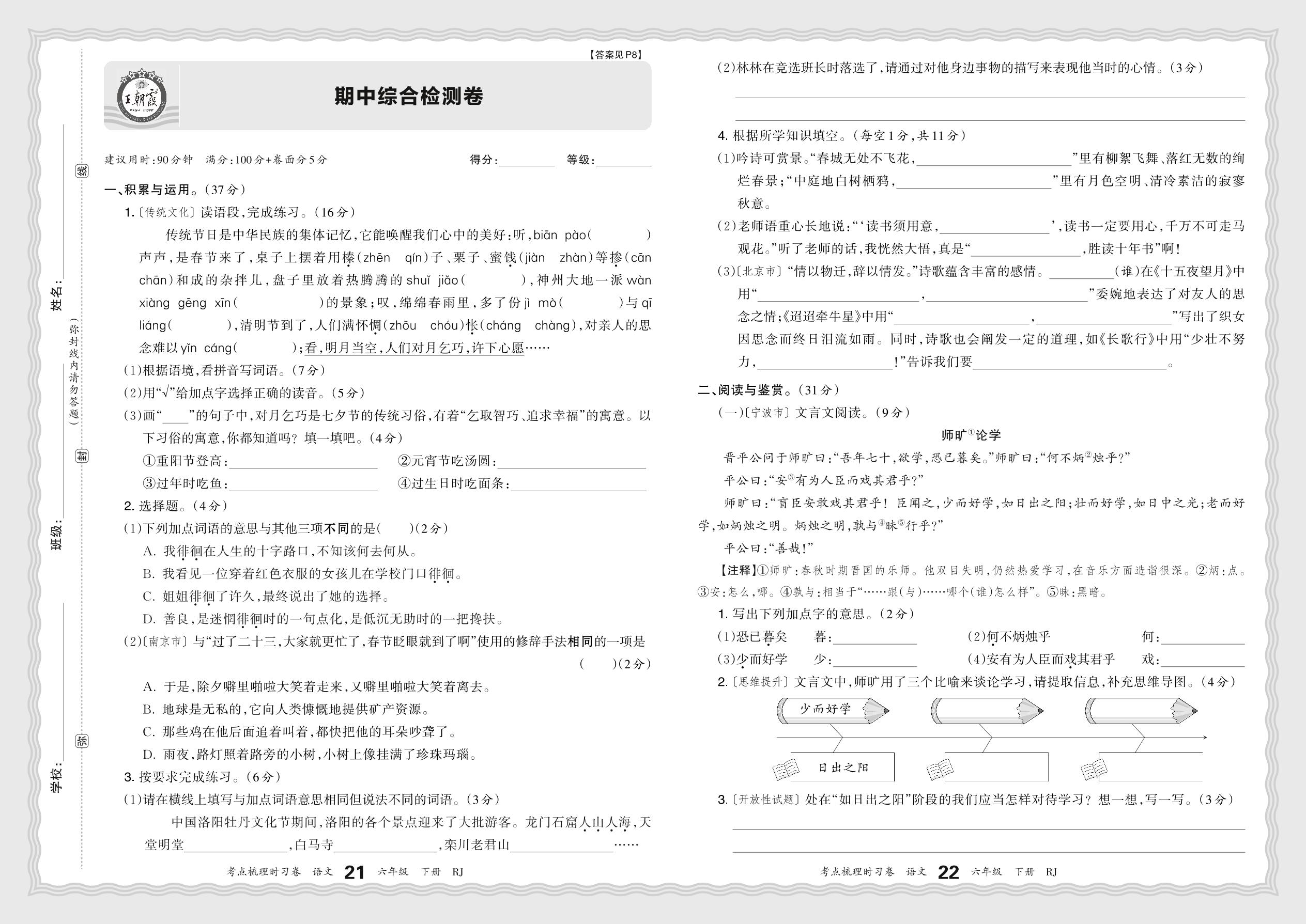 2024春下册六年级语文人教版 期中综合检测卷