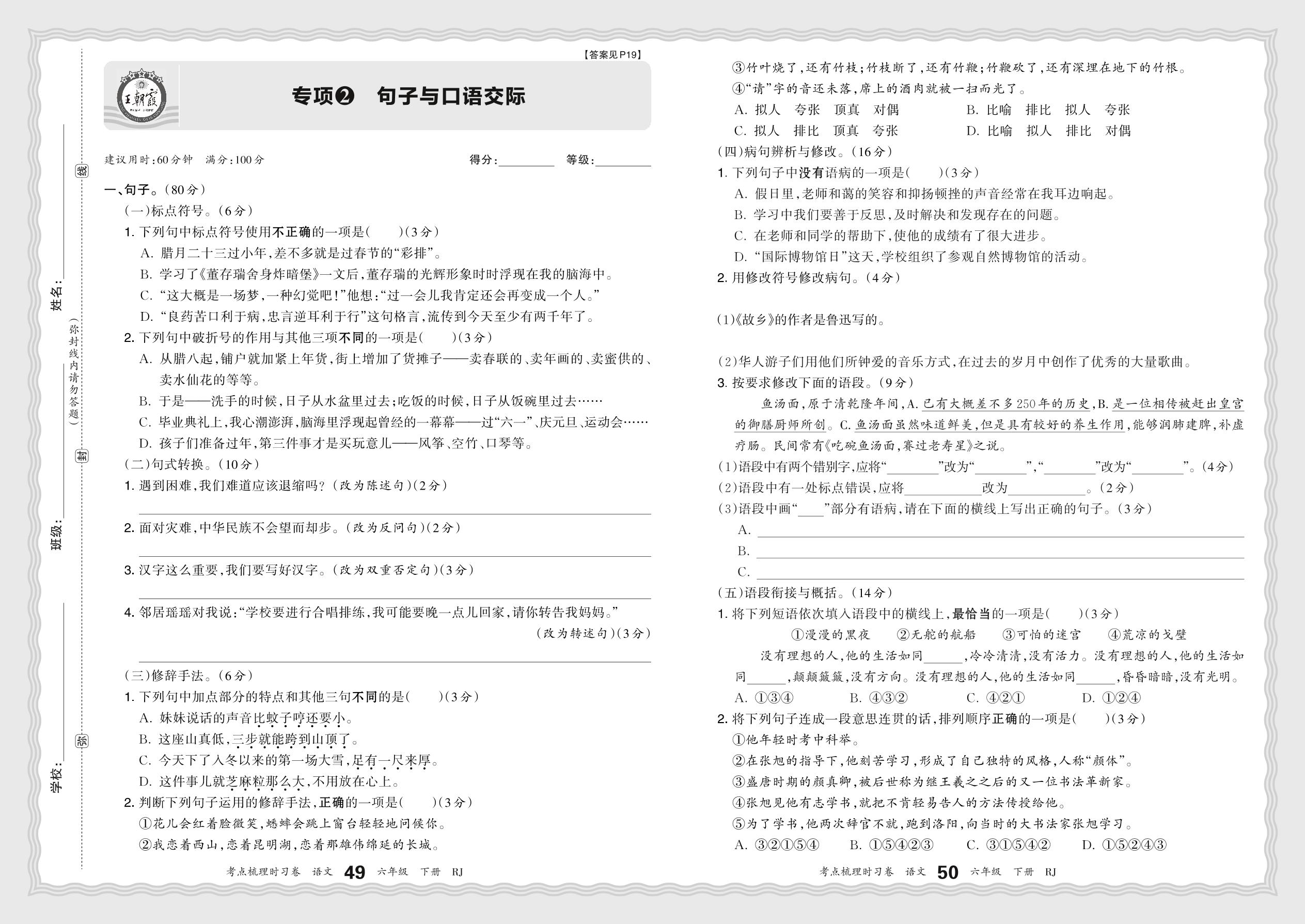2024春下册六年级语文人教版 期末专项卷KD版·句子与口语交际【2】