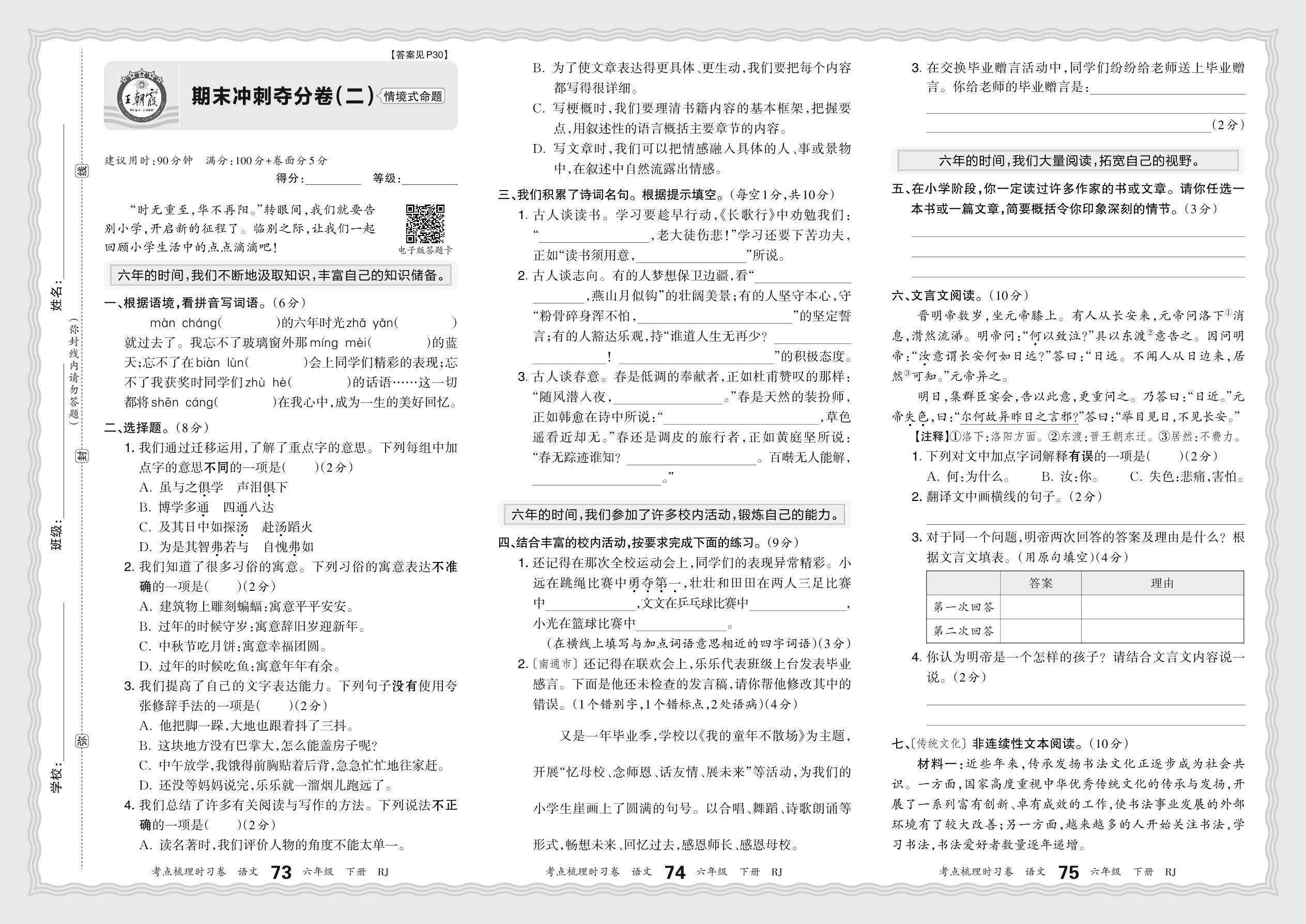 2024春下册六年级语文人教版 期末冲刺夺分卷(二)