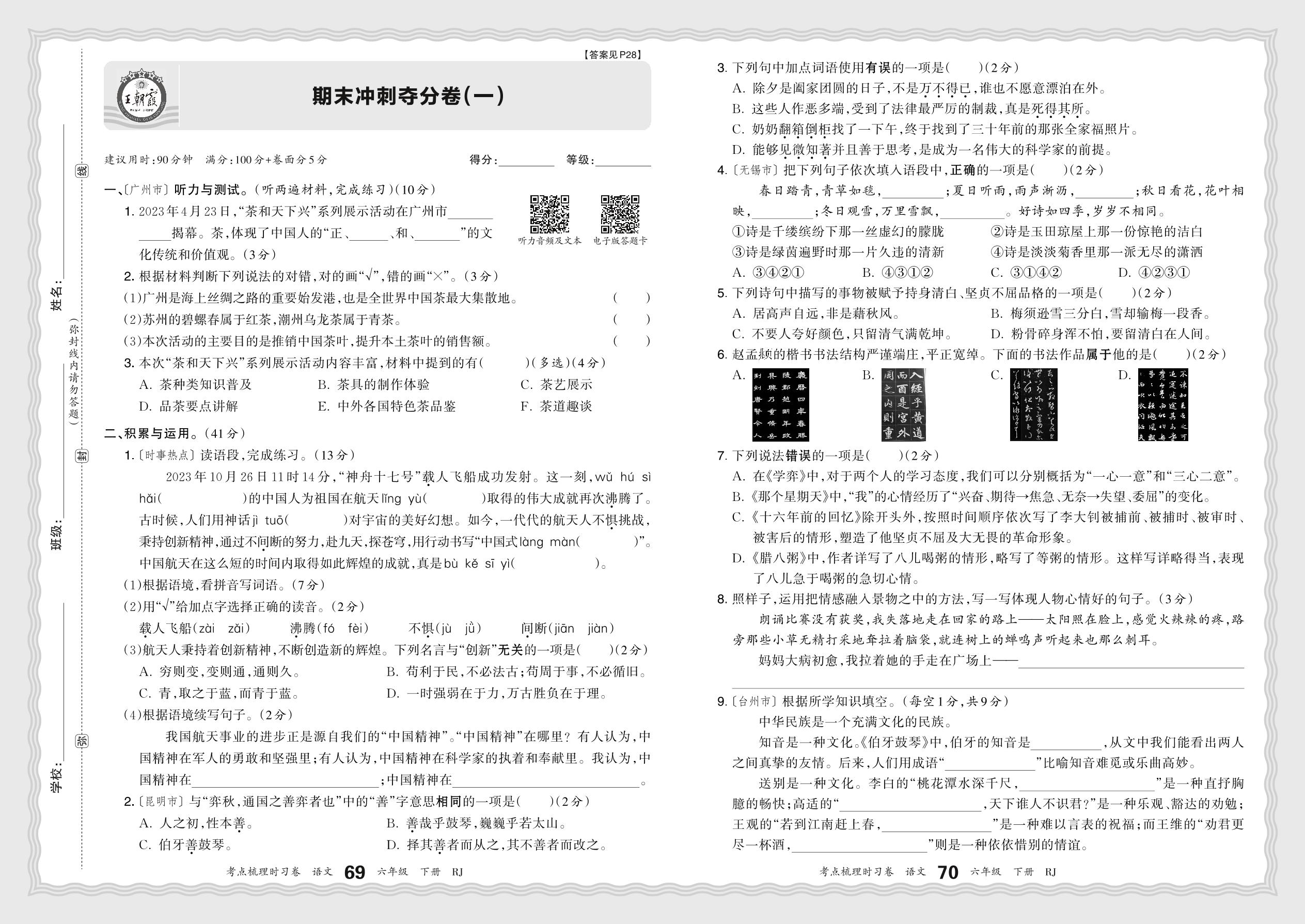 2024春下册六年级语文人教版 期末冲刺夺分卷(一)