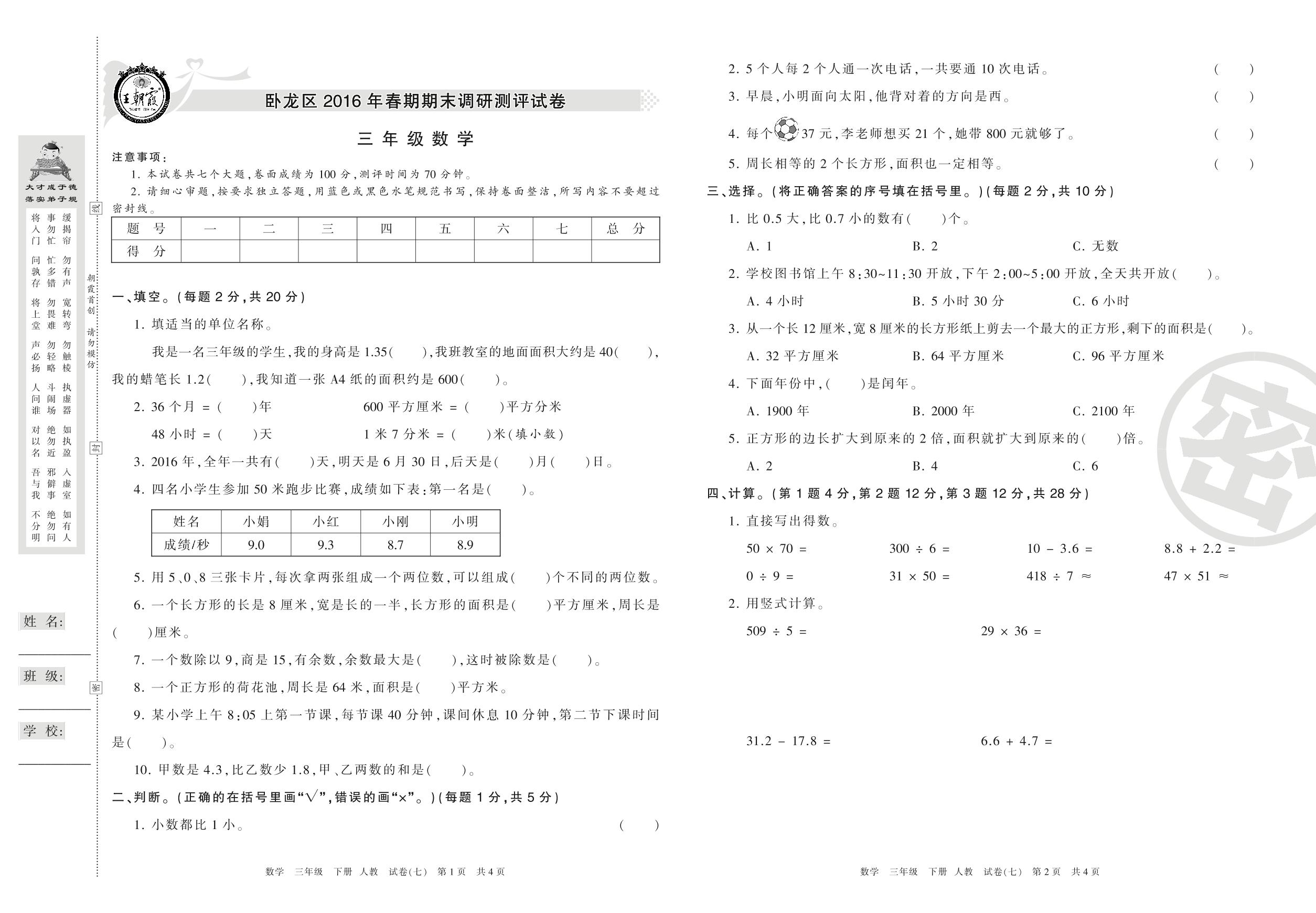 2015-2016学年第二学期南阳市卧龙区三年级数学试卷(人教版)【7】