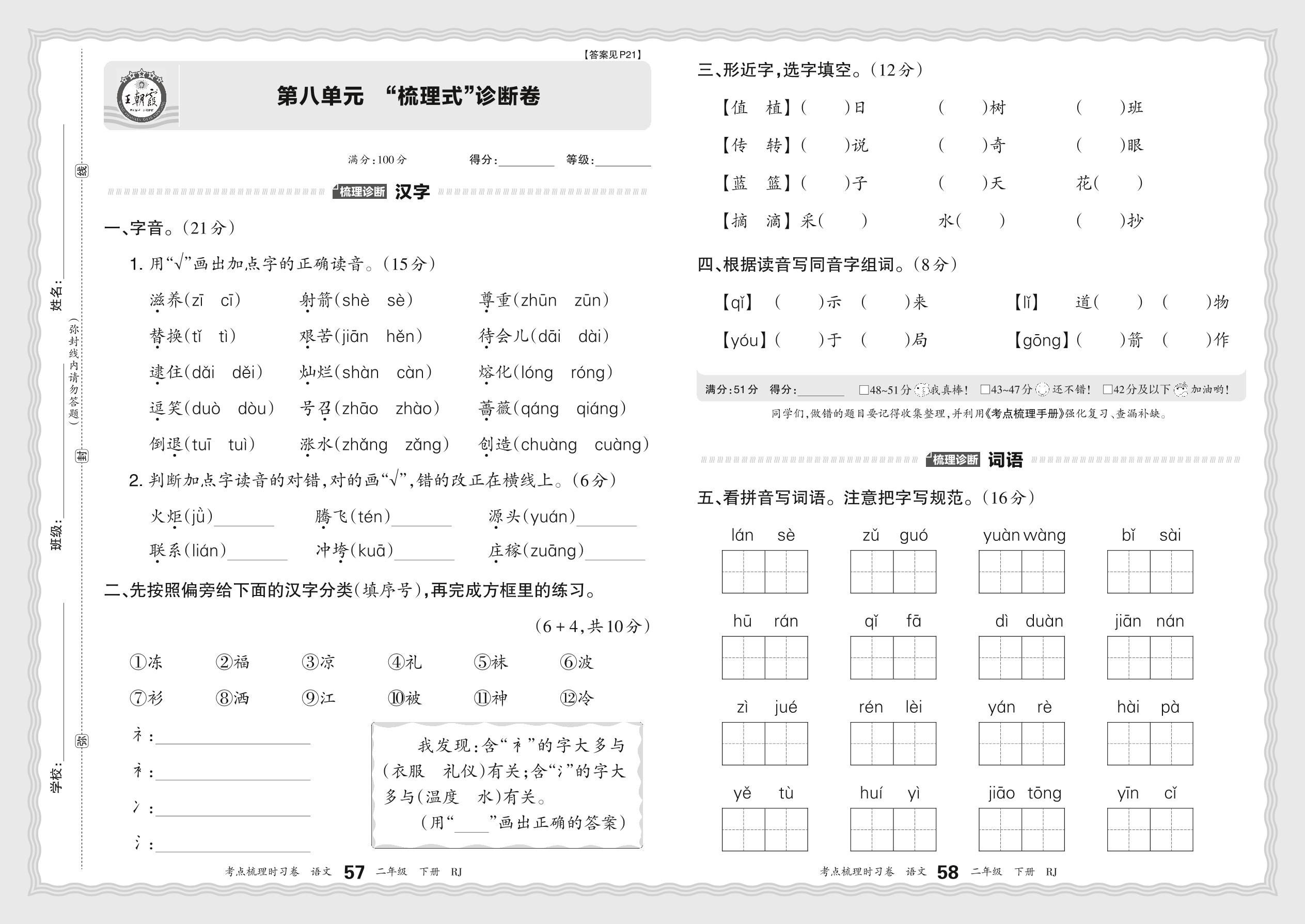 2024春下册二年级语文人教版 第八单元 “梳理式”诊断卷